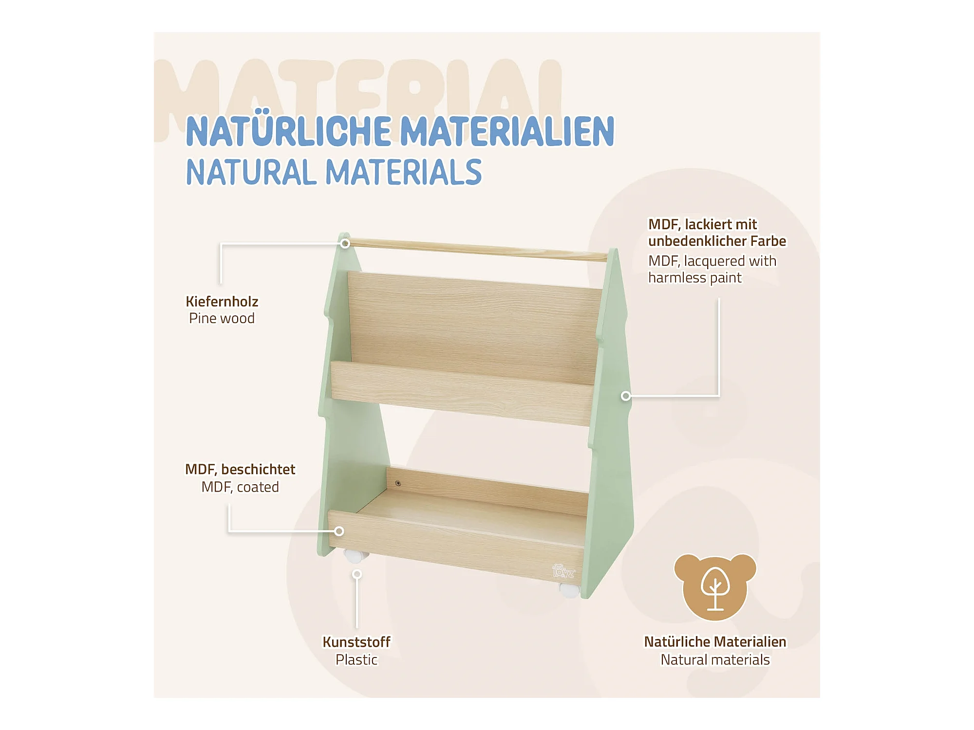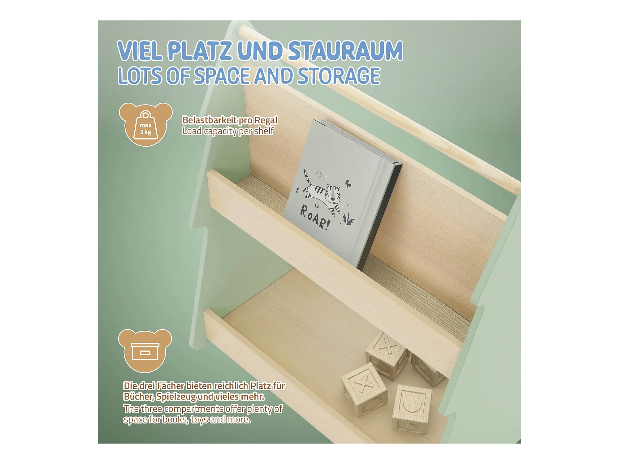 Libreria per bambini design abete cm beige-verde scaffale in legno con 3 ripiani