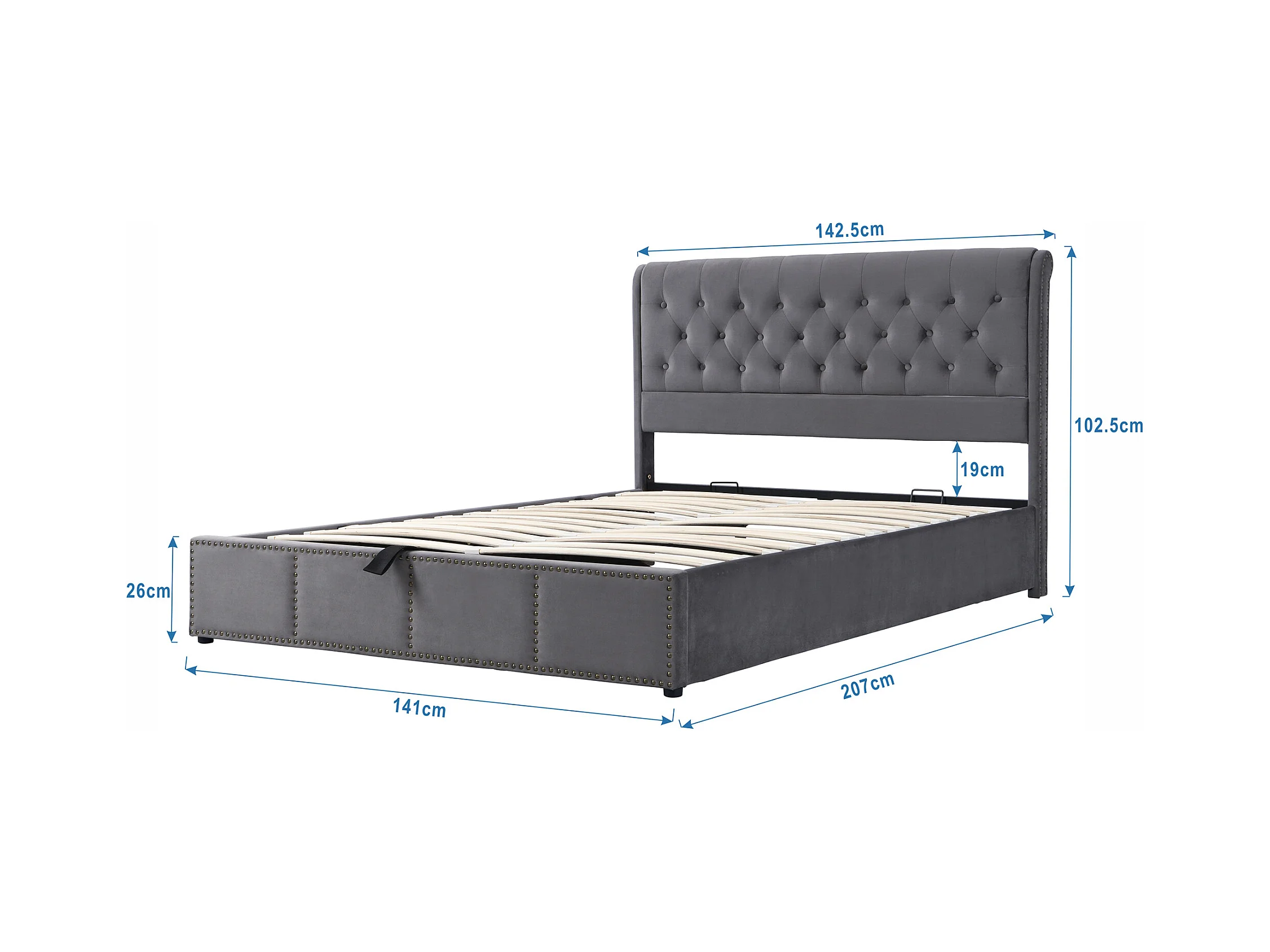 Letto in velluto con ali, bottoni decorativi, idraulico con contenitore, 140x200 cm, grigio (207x146x99 cm)