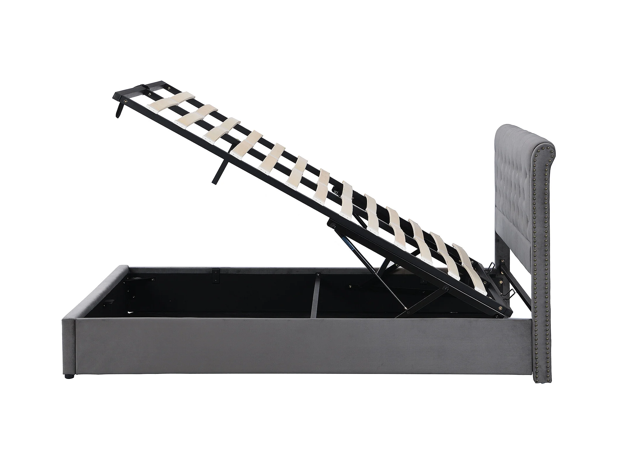 Lit 140x200 cm en velours gris avec sommier, coffre de rangement hydraulique et clous decorativefs