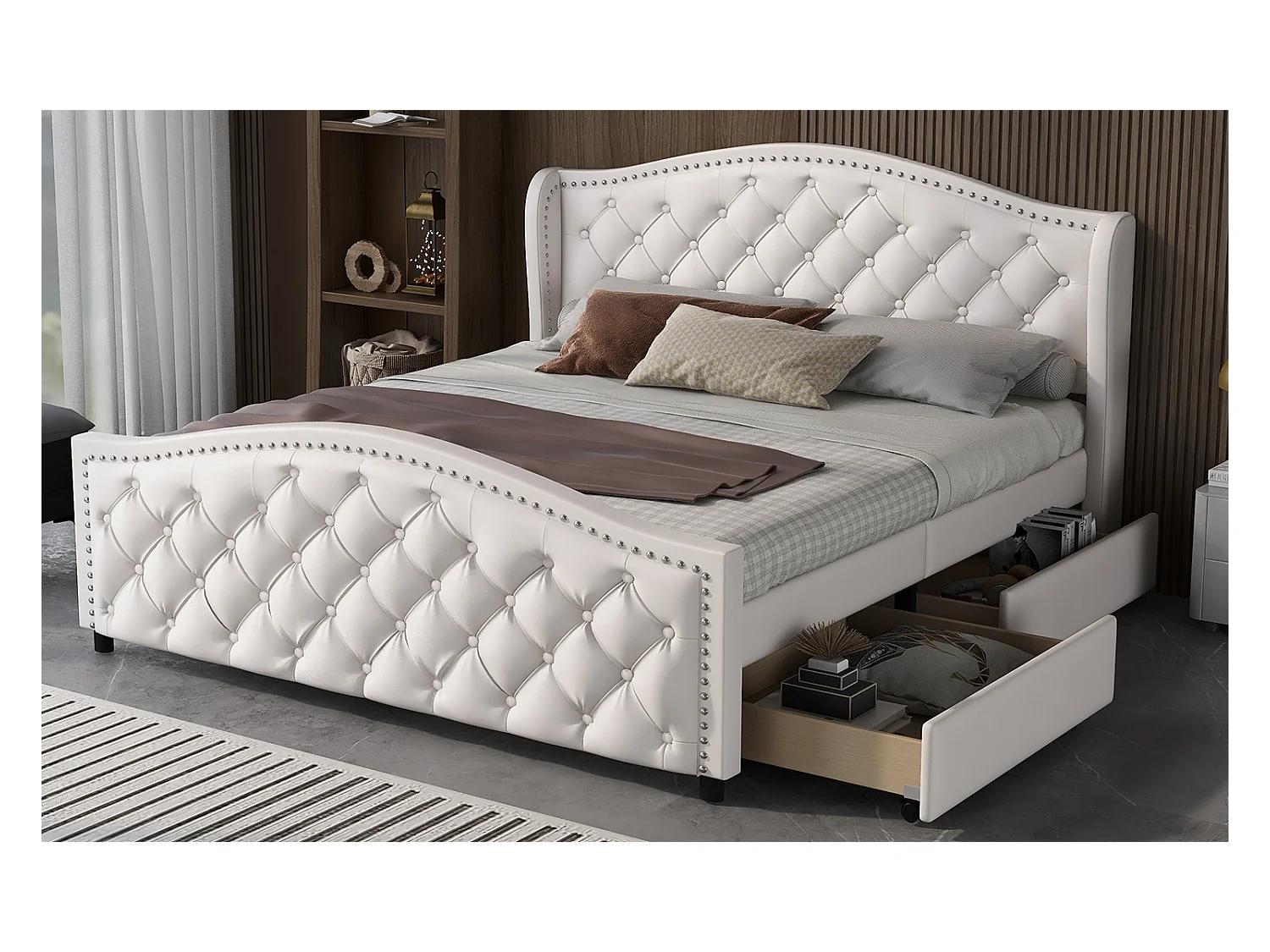 Lit 160x200 bianco in PU e legno con sommier, 2 cassetti e tête de lit rimborsato