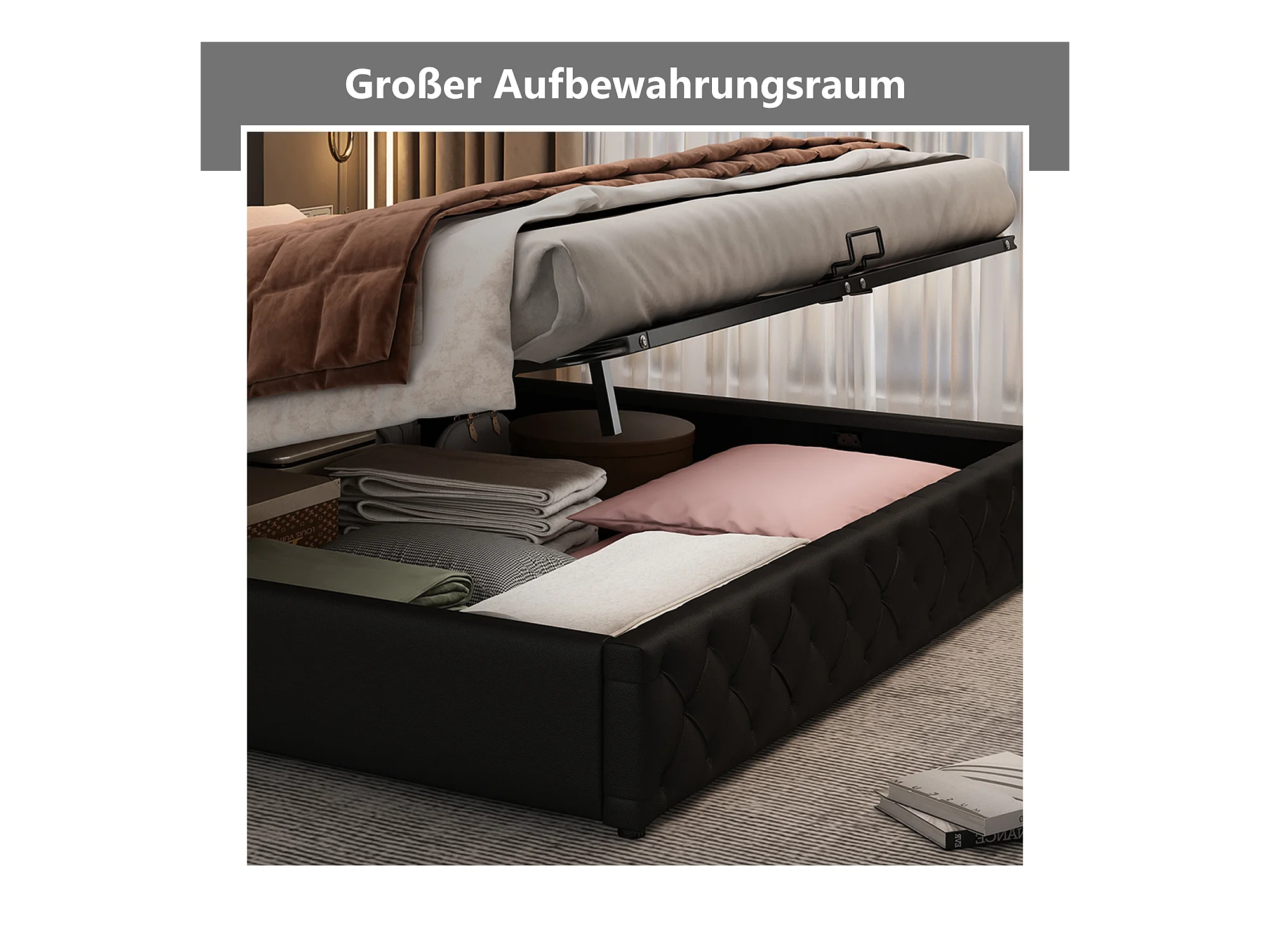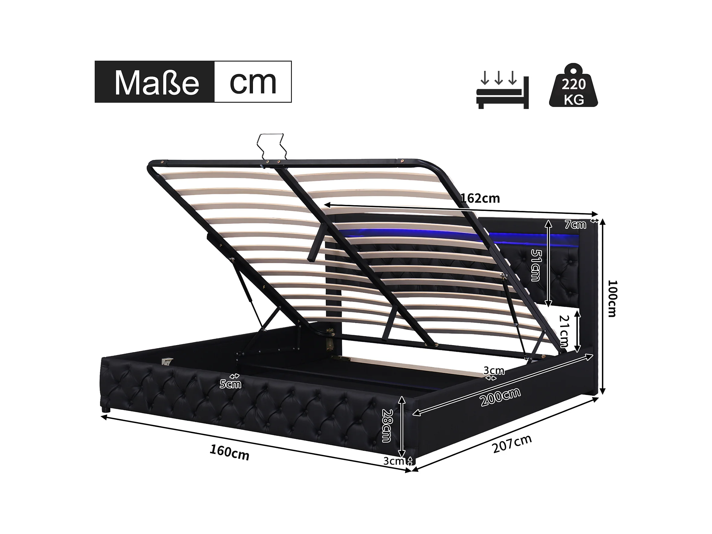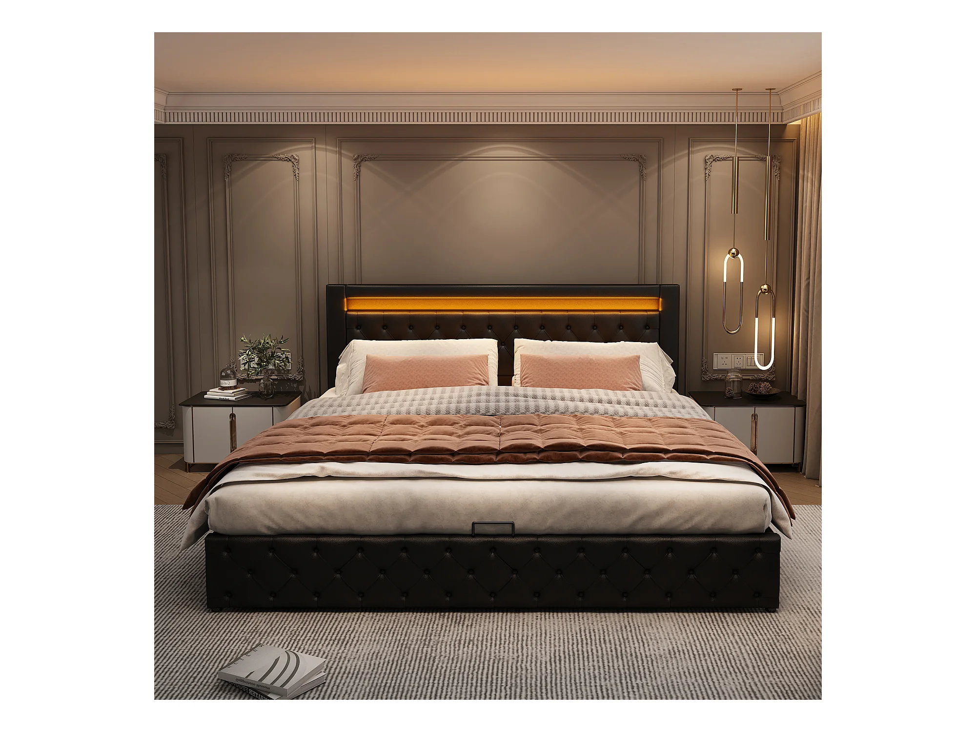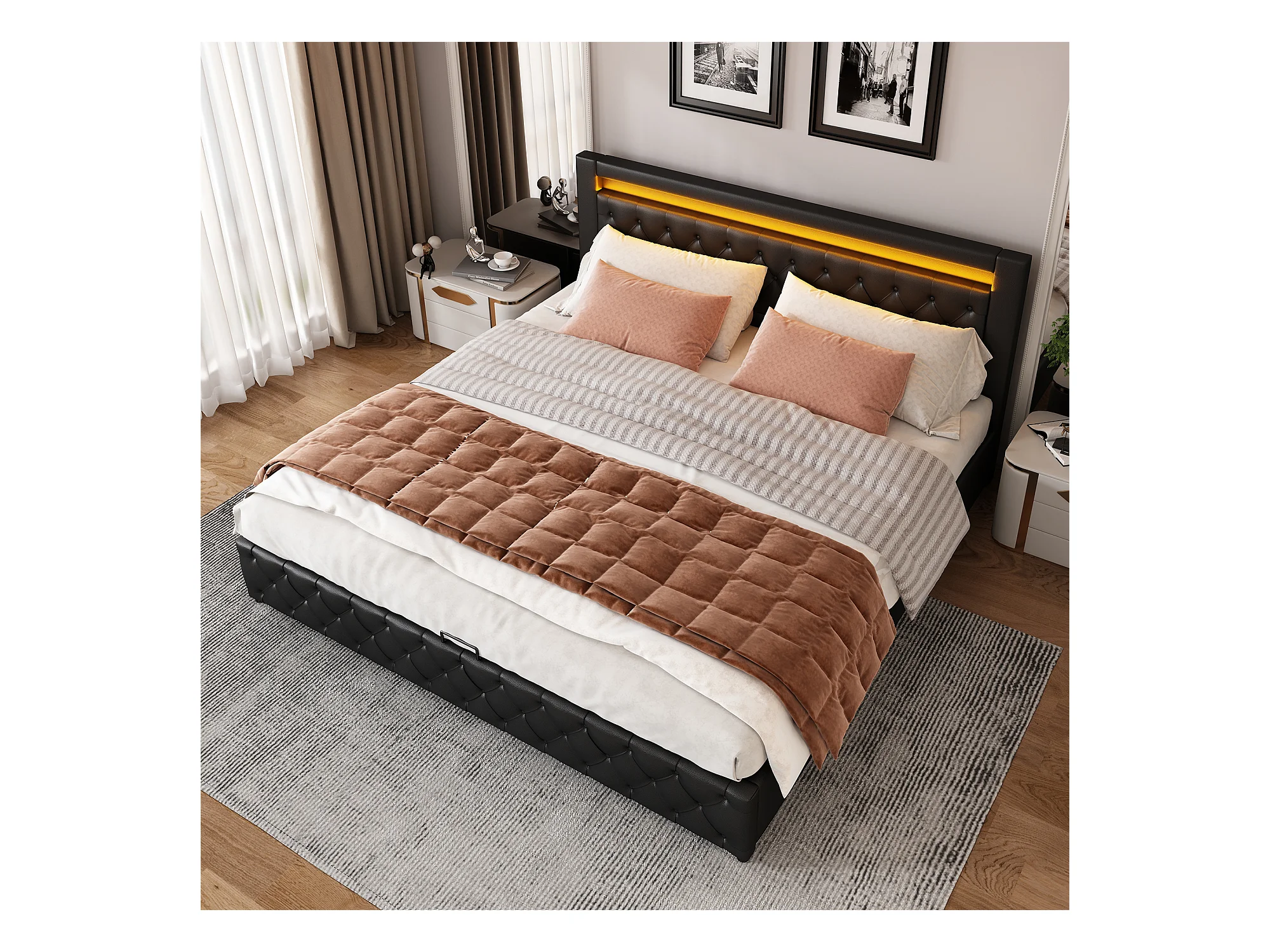 Lit 160x200 nero in PU con LED integrato, sommier et grand rangement, design funzionale