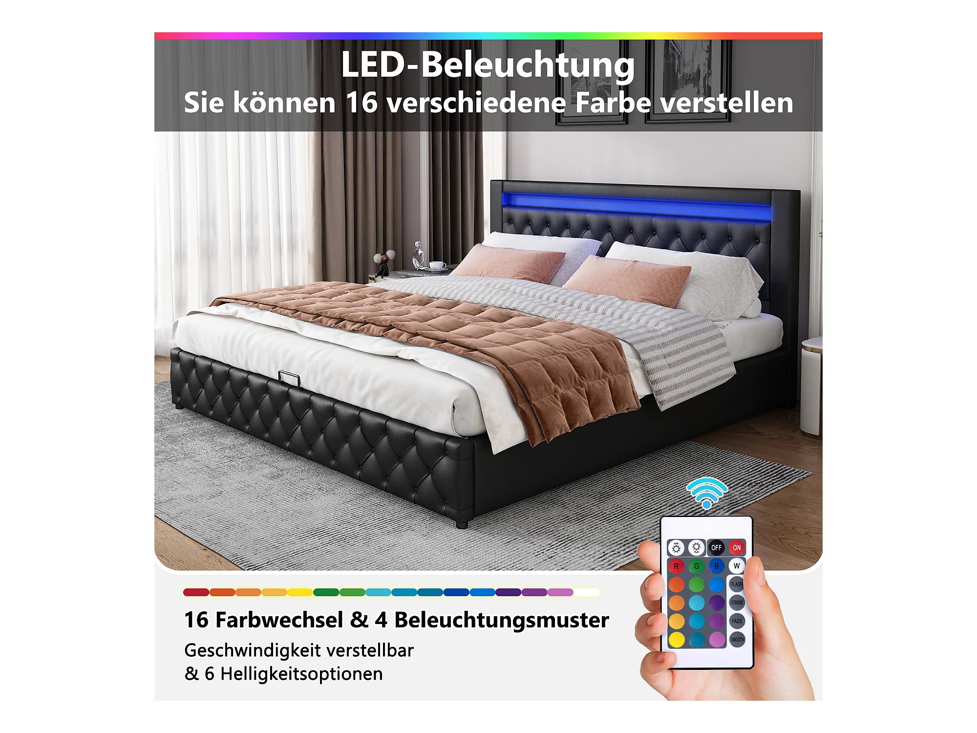 Lit rembourré 160x200 PU nero con LED, porte USB e pratico orientamento per adulti