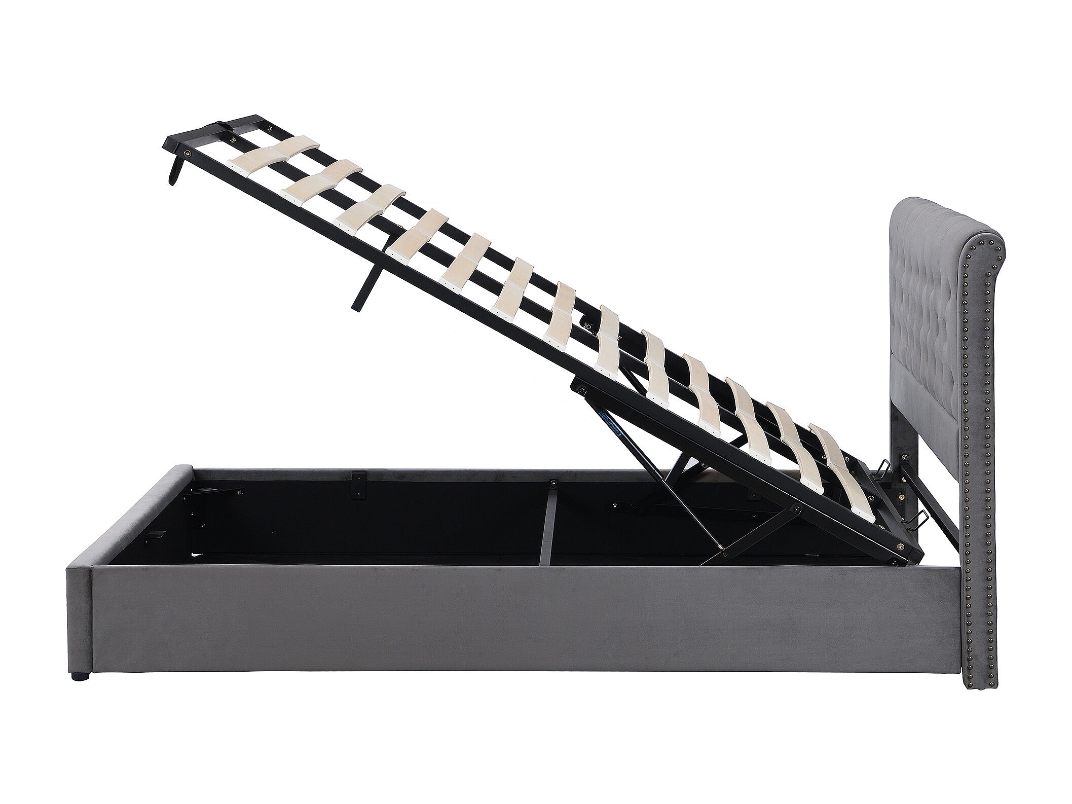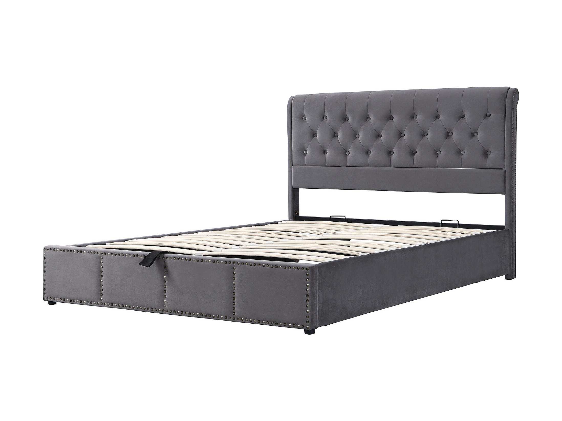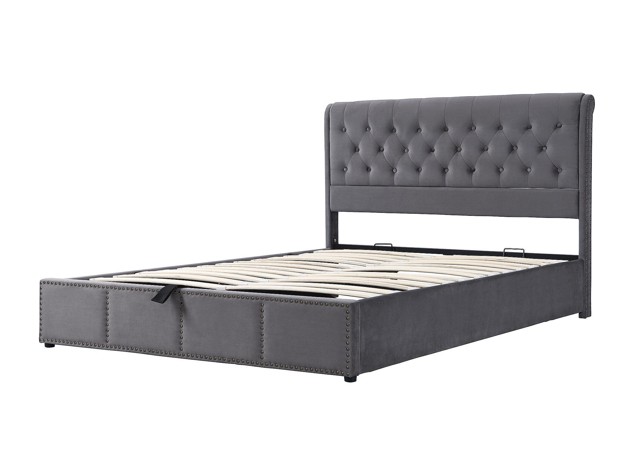 Lit 180x200 cm in velluto grigio con coffre de rangement hydraulique et clous decoratives