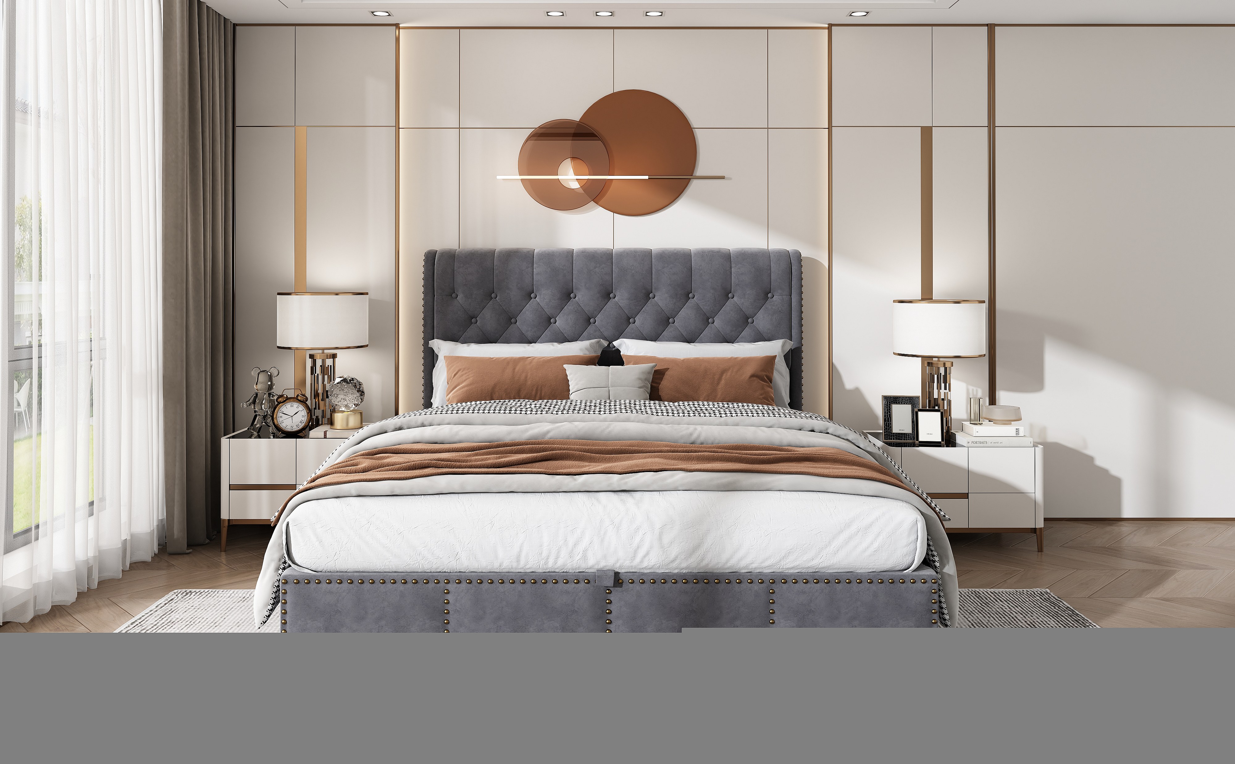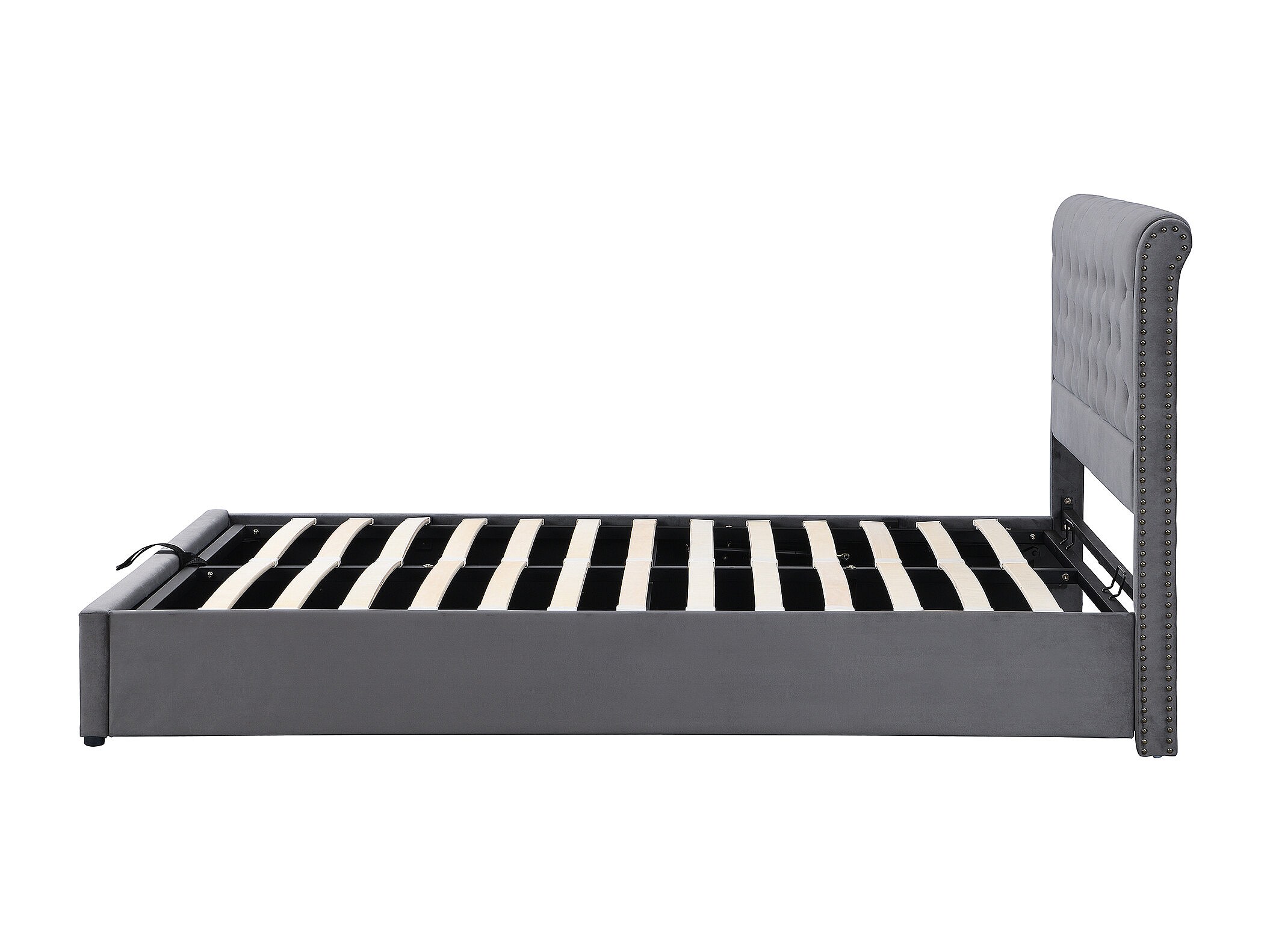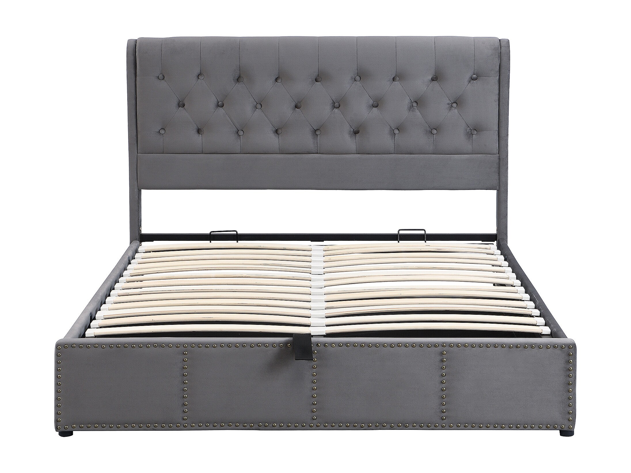 Lit 180x200 cm in velluto grigio con coffre de rangement hydraulique et clous decoratives
