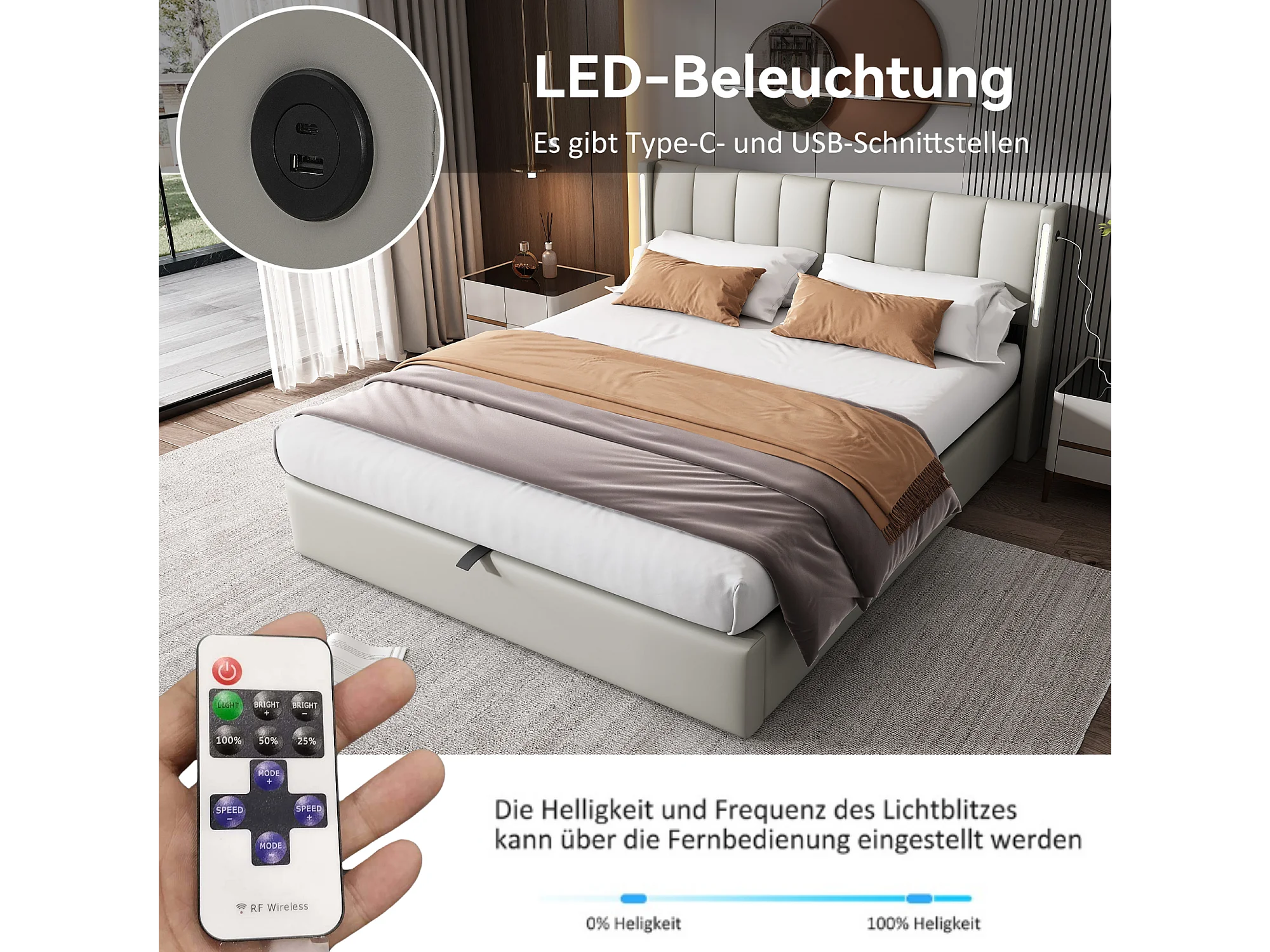 Lit doppio 140x200 grigio PU con LED, caffè idraulico, testa regolabile e USB