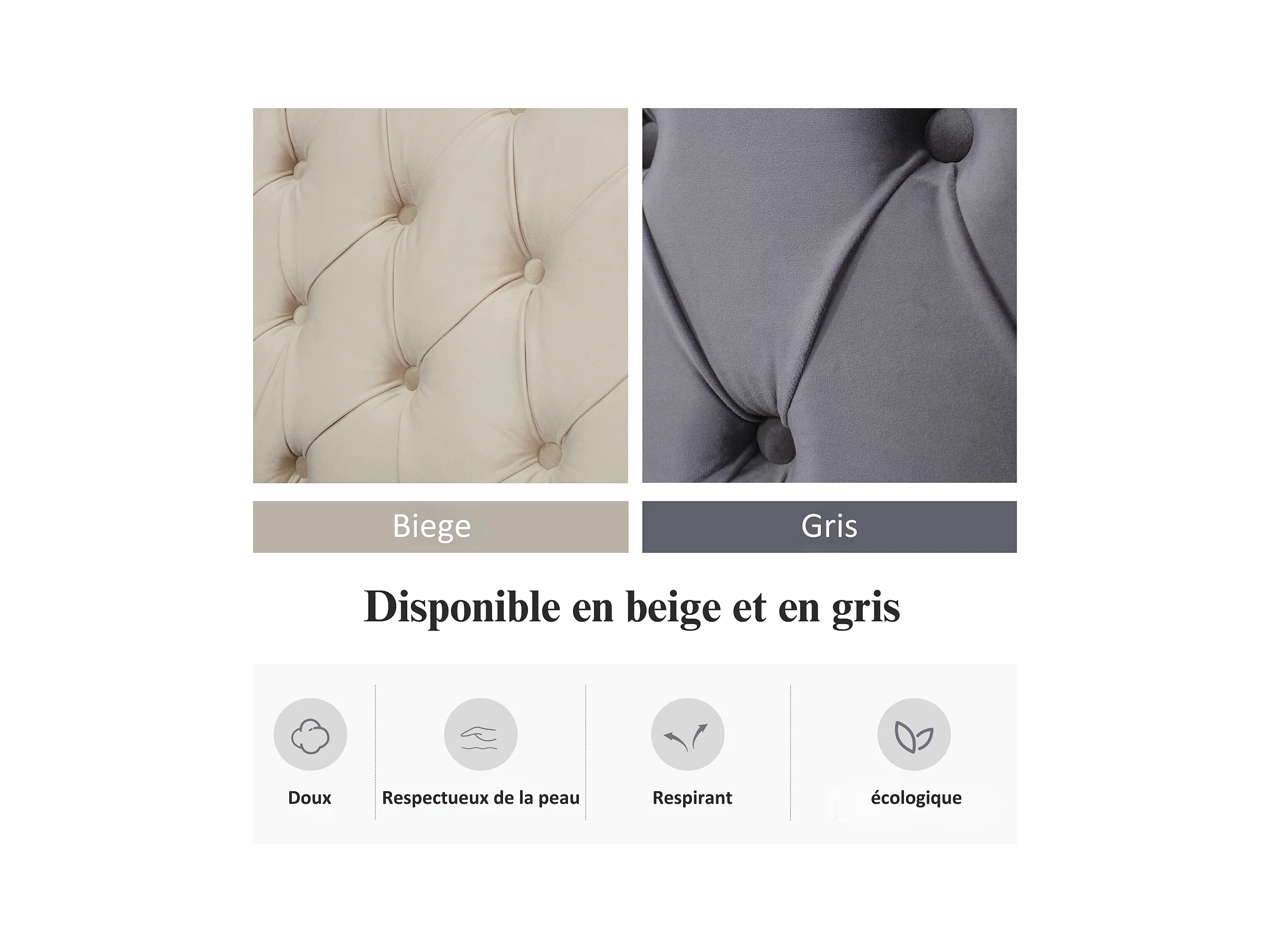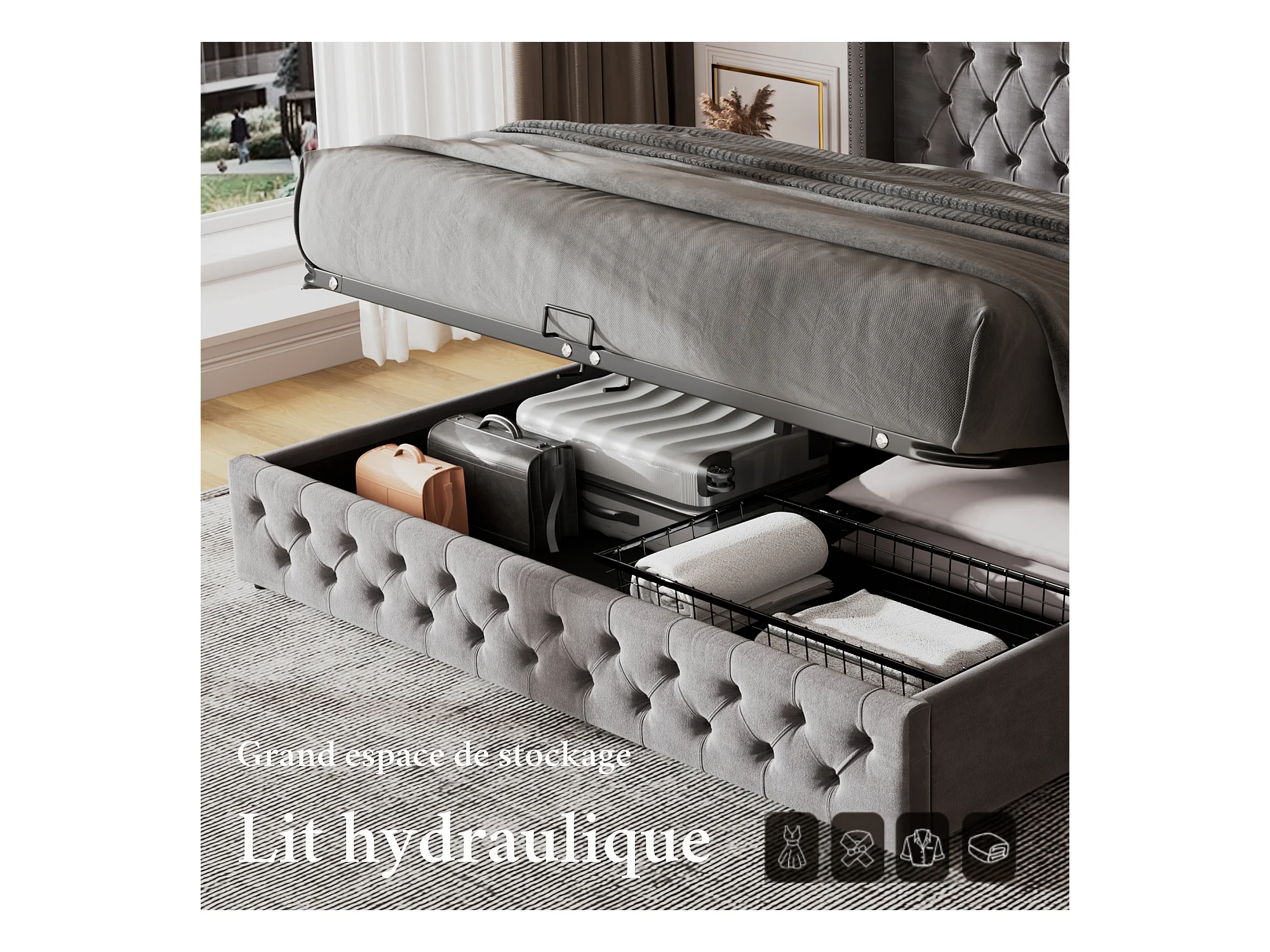 Lit double 140x190 cm velours gris con rangement hydraulique et tête de lit réglable