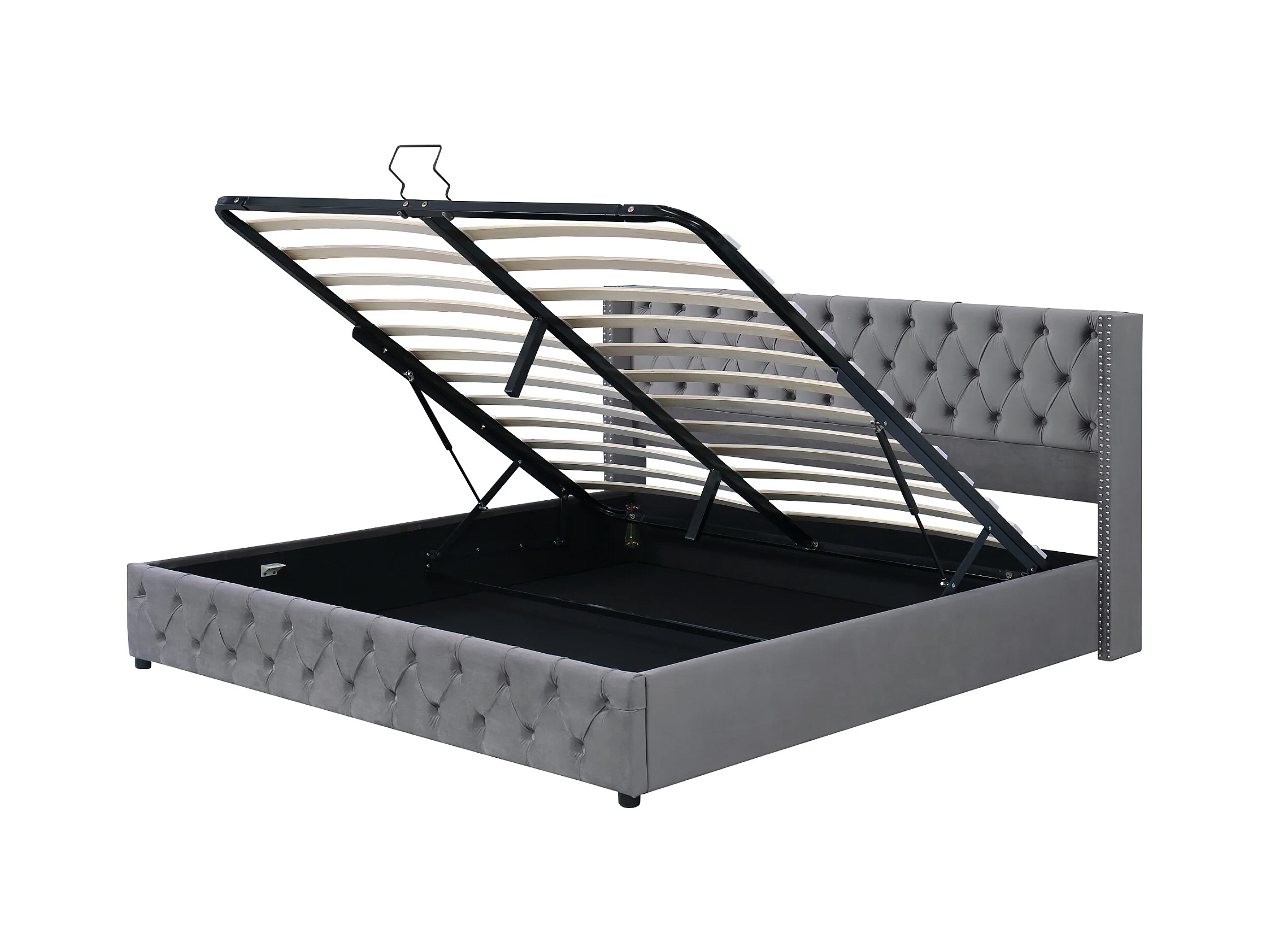 Lit tapissé 140x190 cm velours gris con sommier hydraulique et rangement