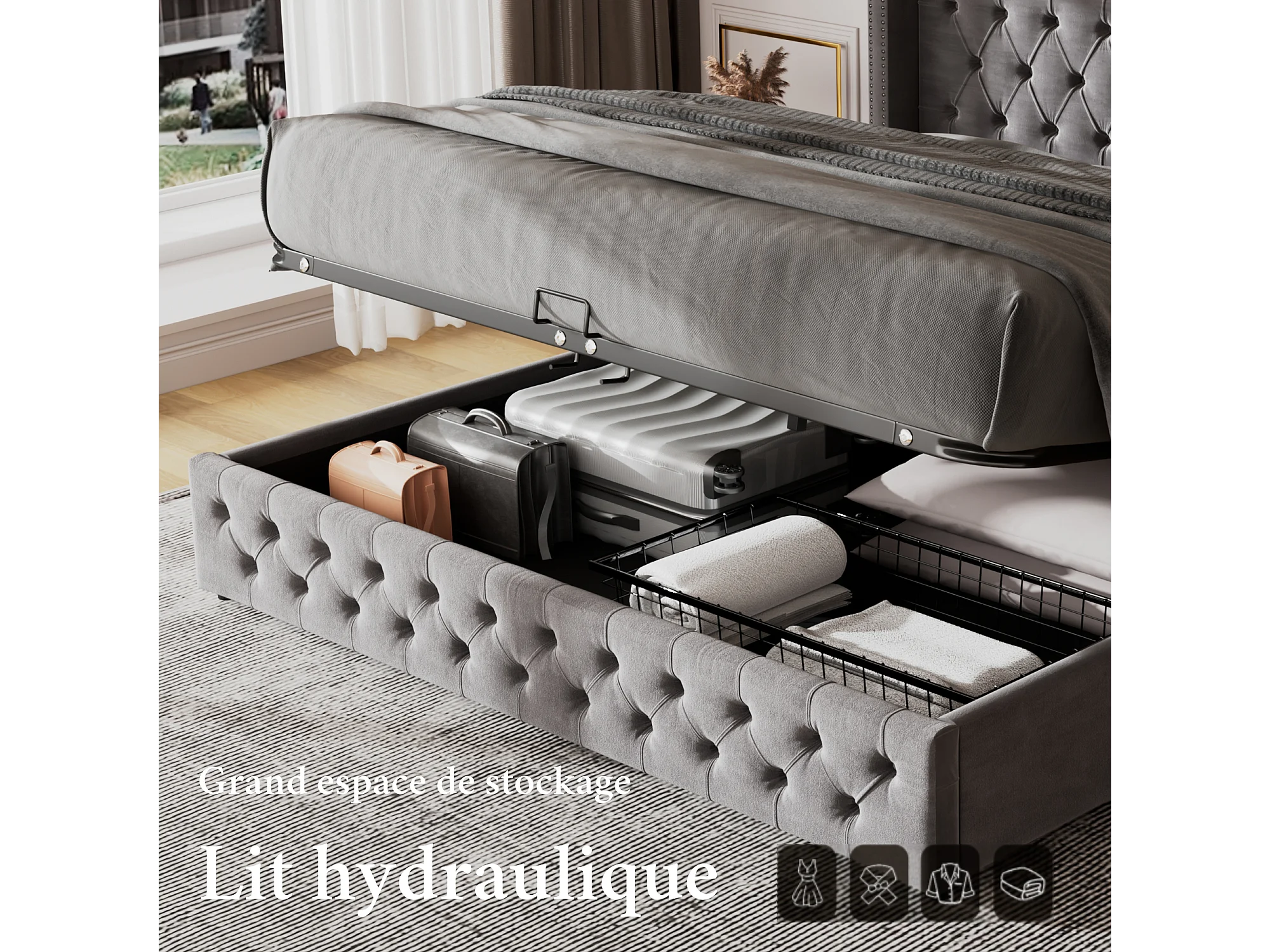 Lit double 140x190 en flanelle gris, lit rembourré oreille con coffre hydraulique et sommier à lattes