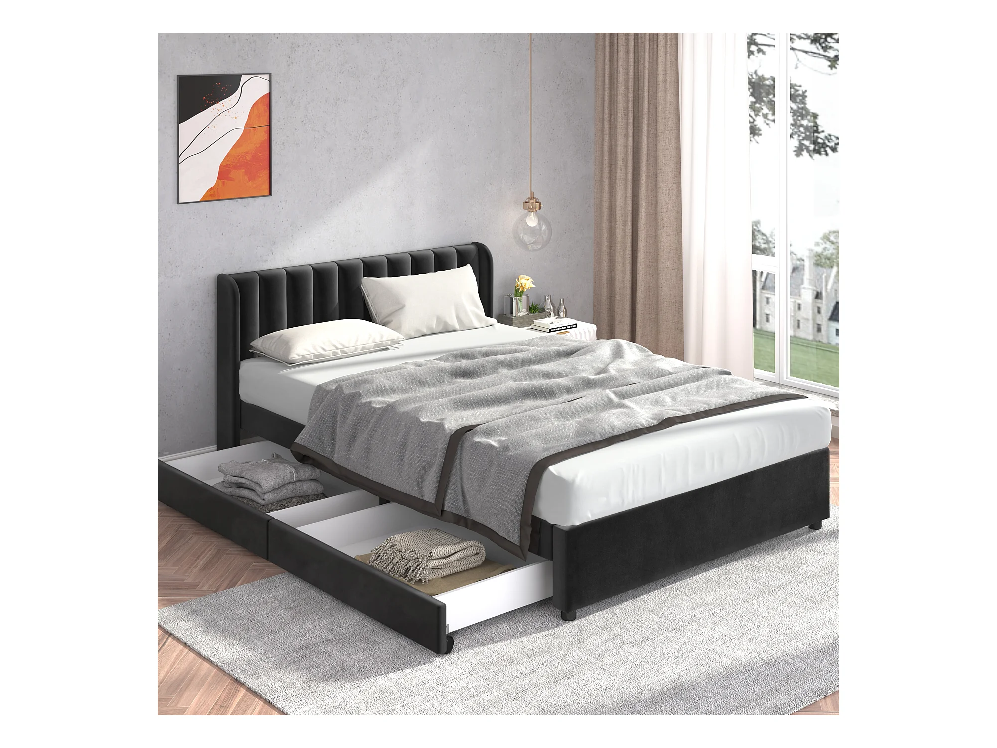 Letto matrimoniale 140x200 cm - con 2 cassetti - in velluto nero (senza materasso)