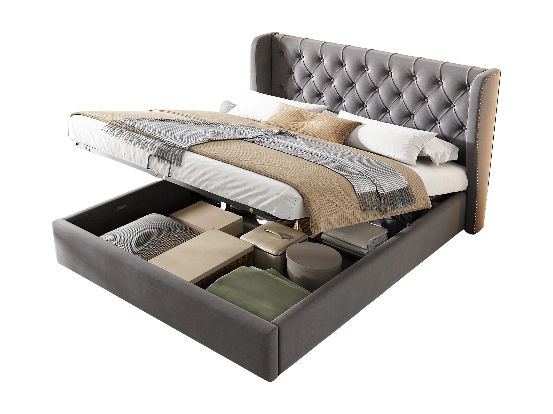 Lit double 140x200 velours gris con coffre hydraulique et tête de lit capitonnée