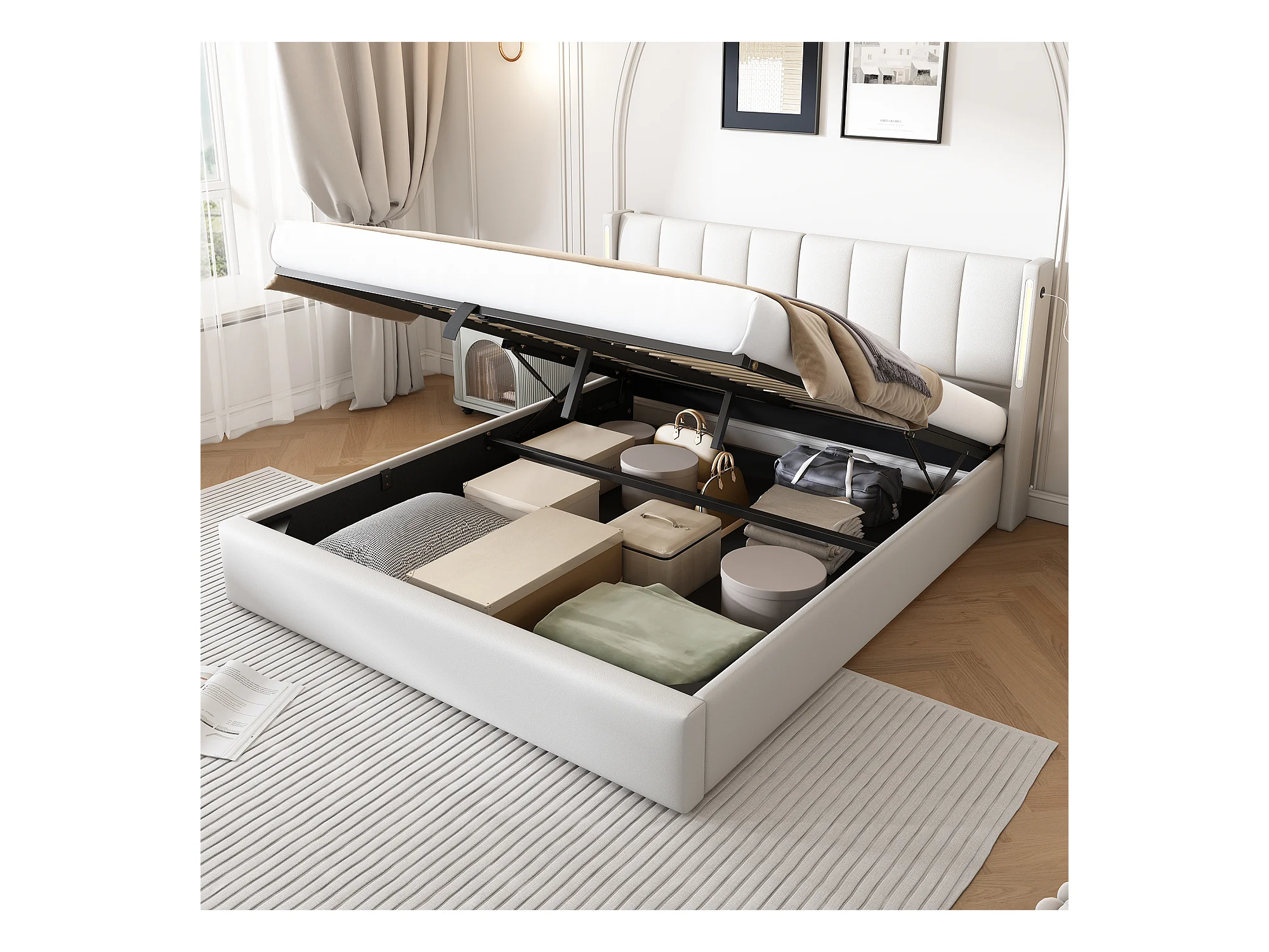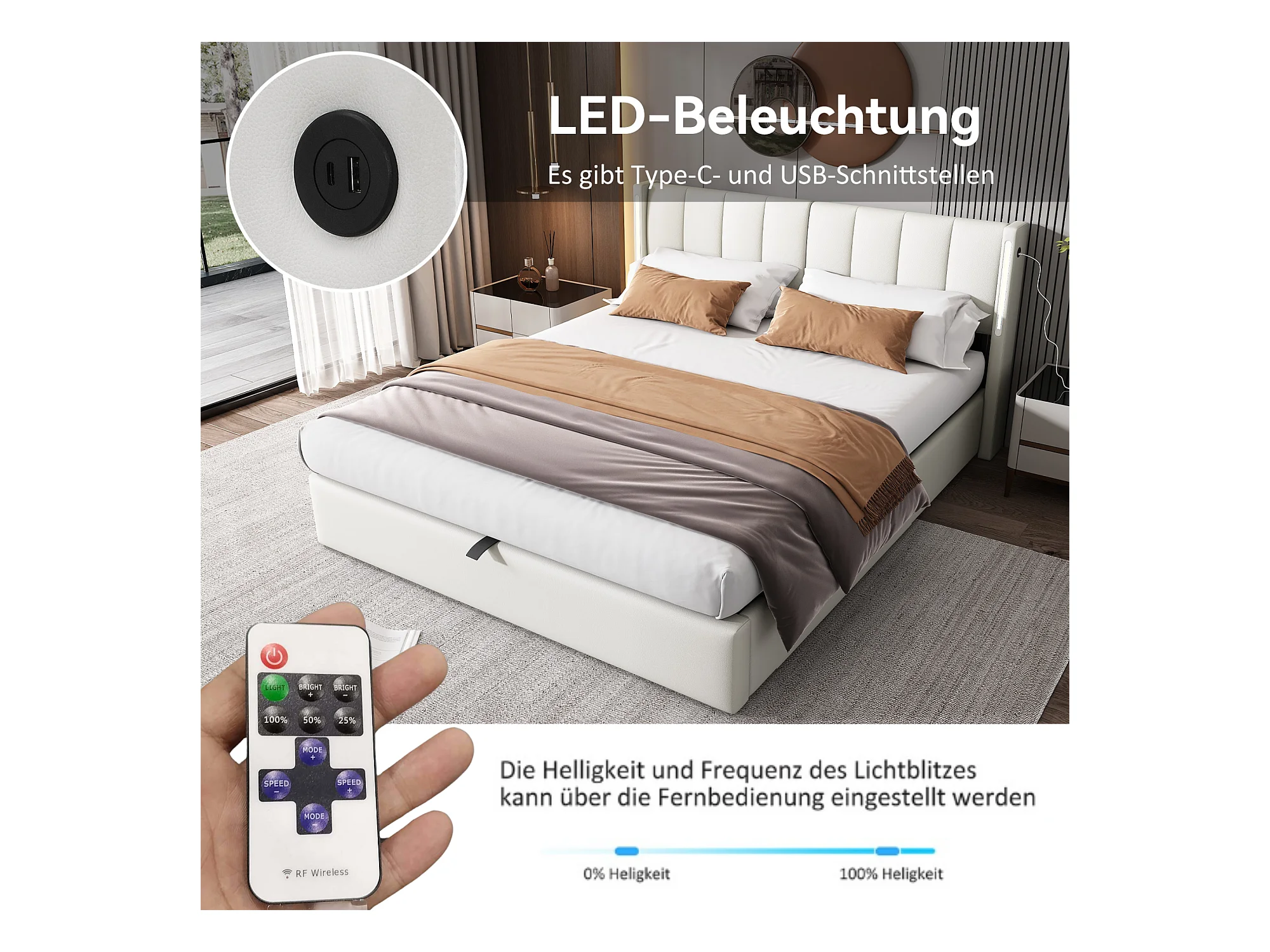 Lit double 160x200 bianco PU con LED, cassetto idraulico, testa regolabile e USB