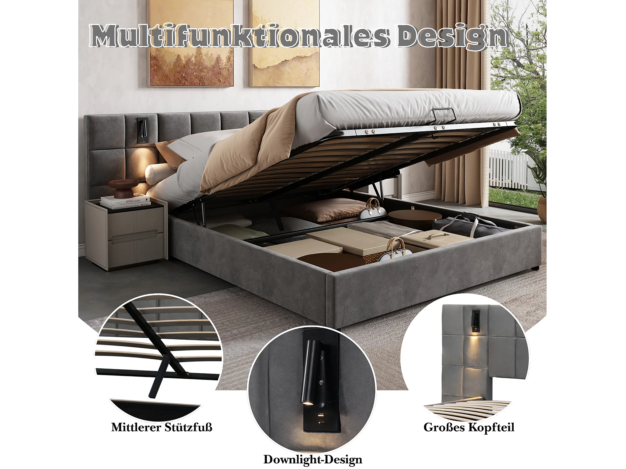 Lit double 160x200 grigio in velluto con cassetto idraulico, testa grande, lampada e USB