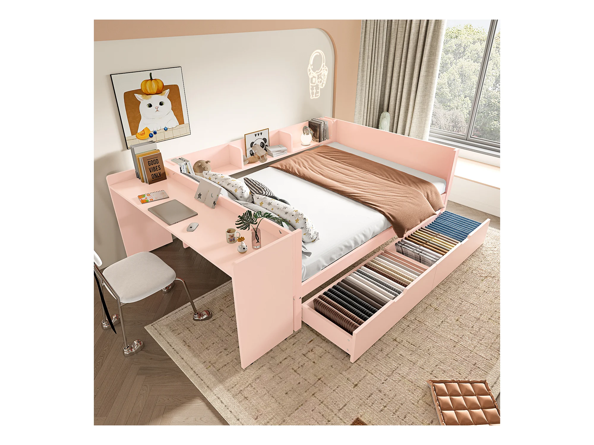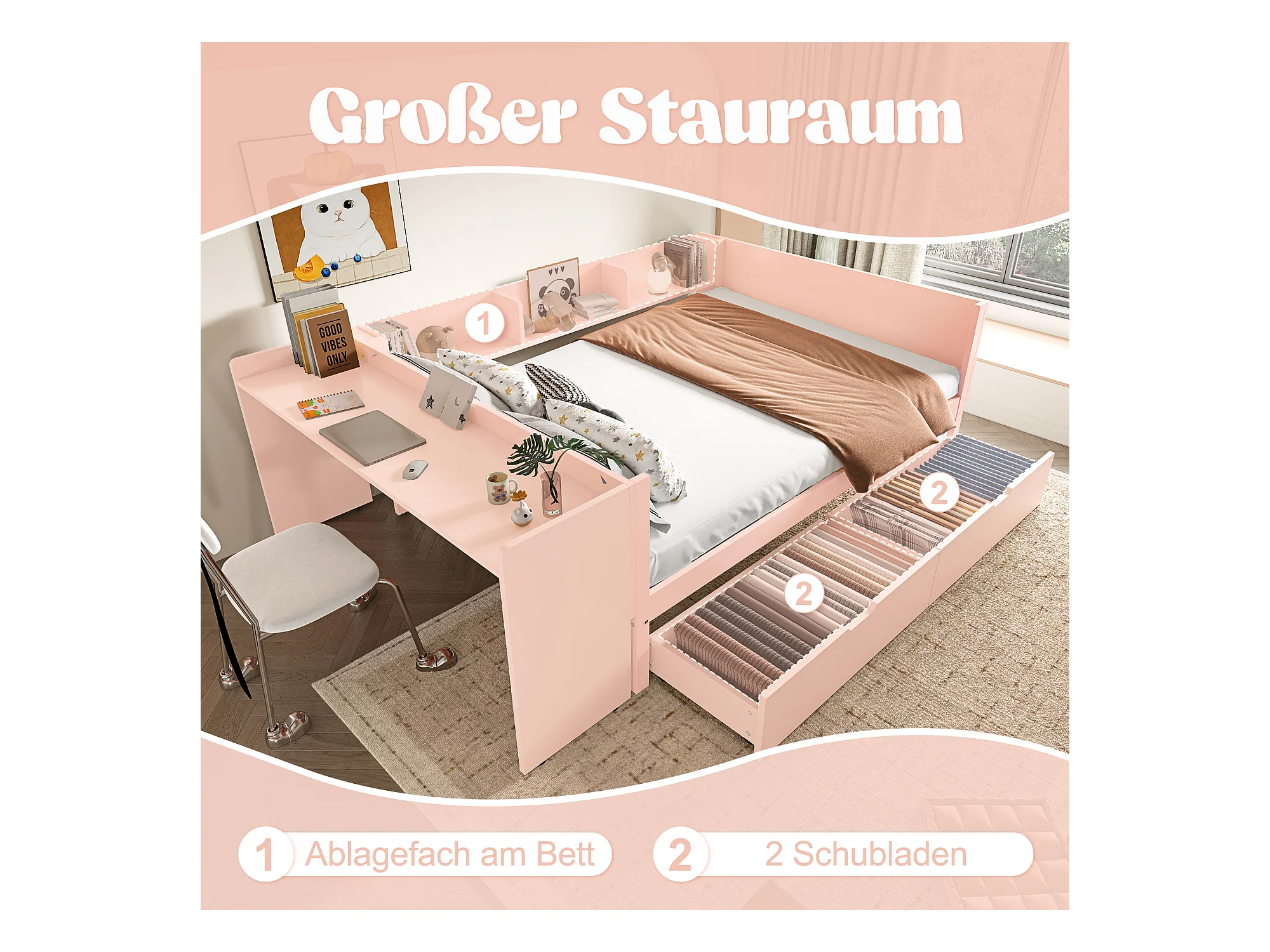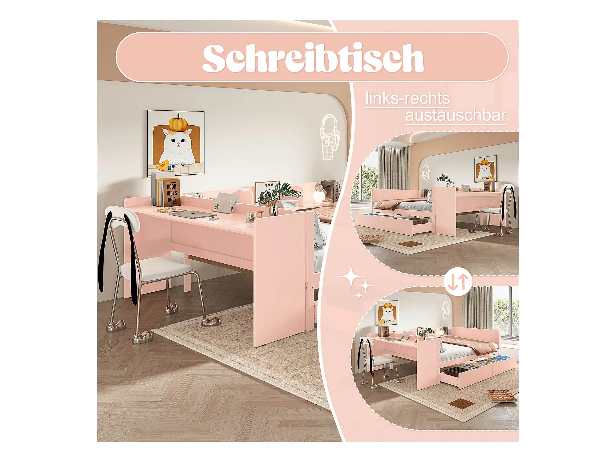 Lit enfant 140x200 cm bois avec Bureau et tiroirs rose
