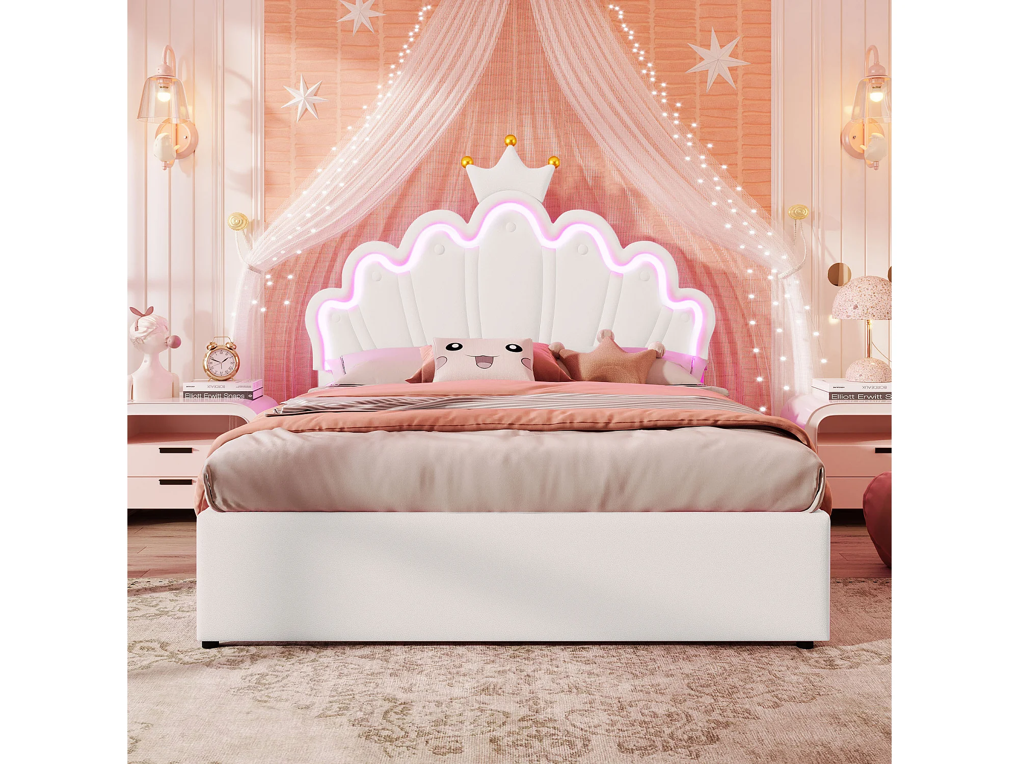 Letto per bambina 140x200 cm in similpelle bianca con LED – Testiera Crown, rete inclusa, senza materasso