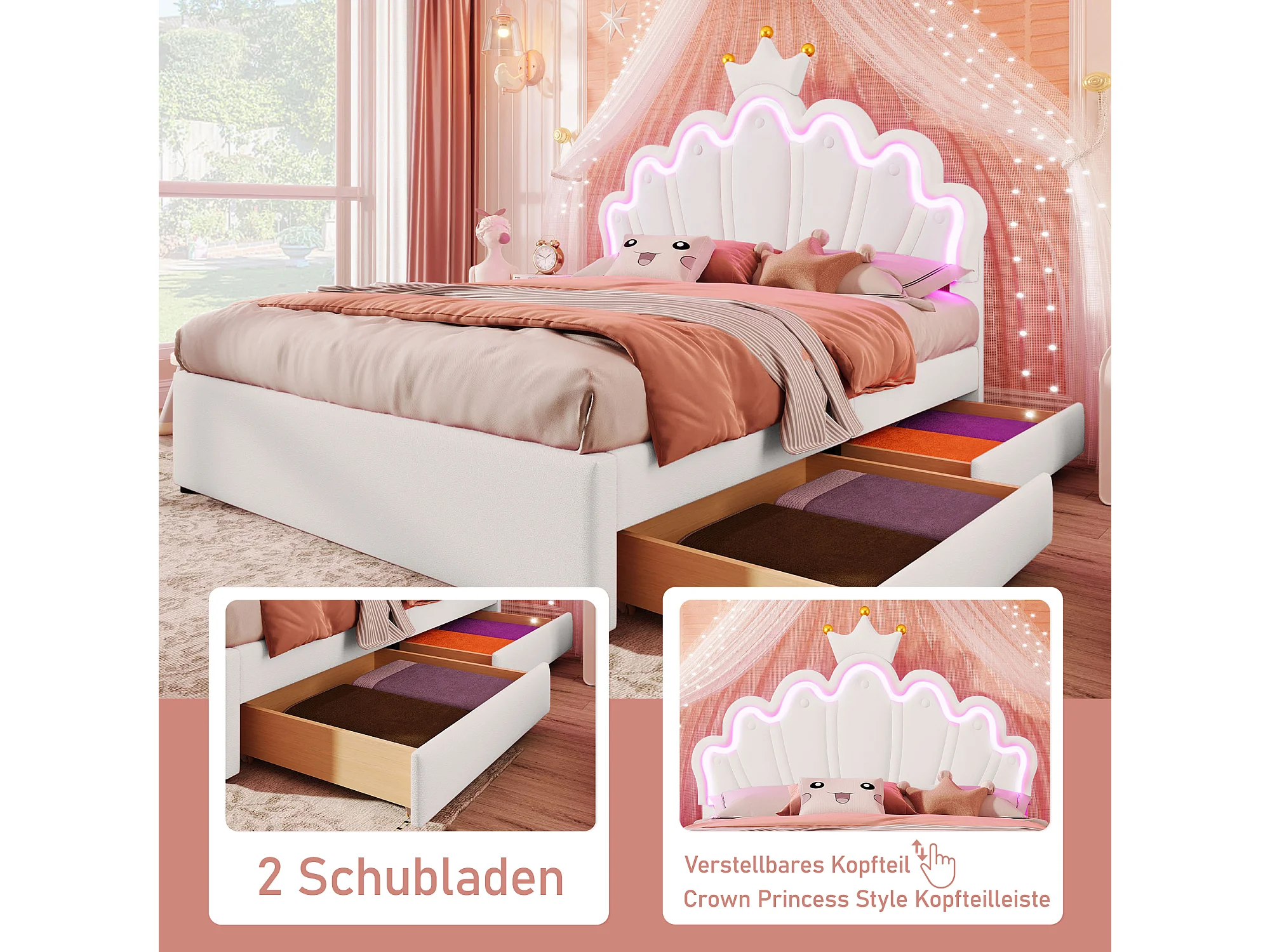 Lit enfant 140x200 cm PU con LED télécommandée, tiroirs et tête réglable blanc