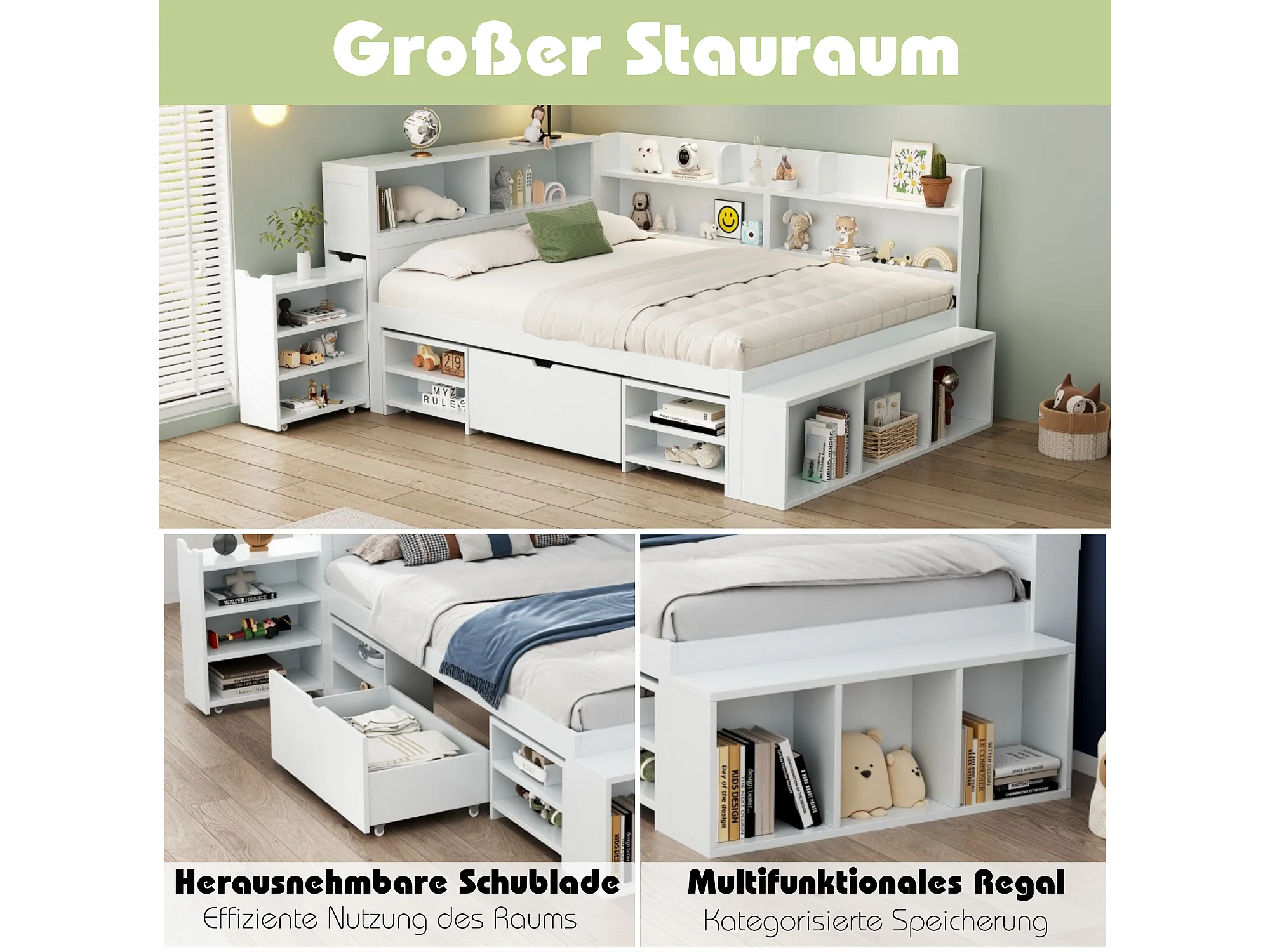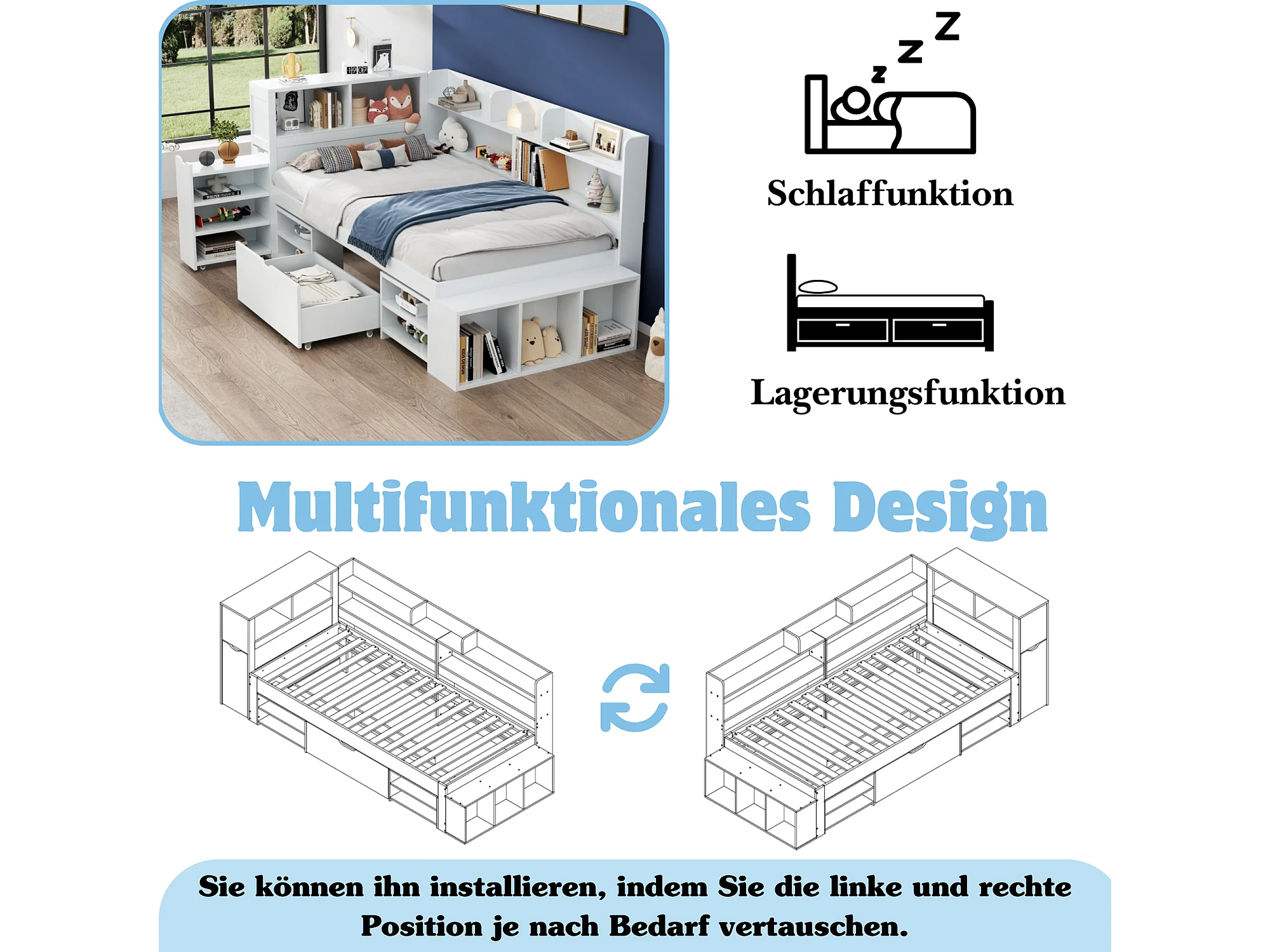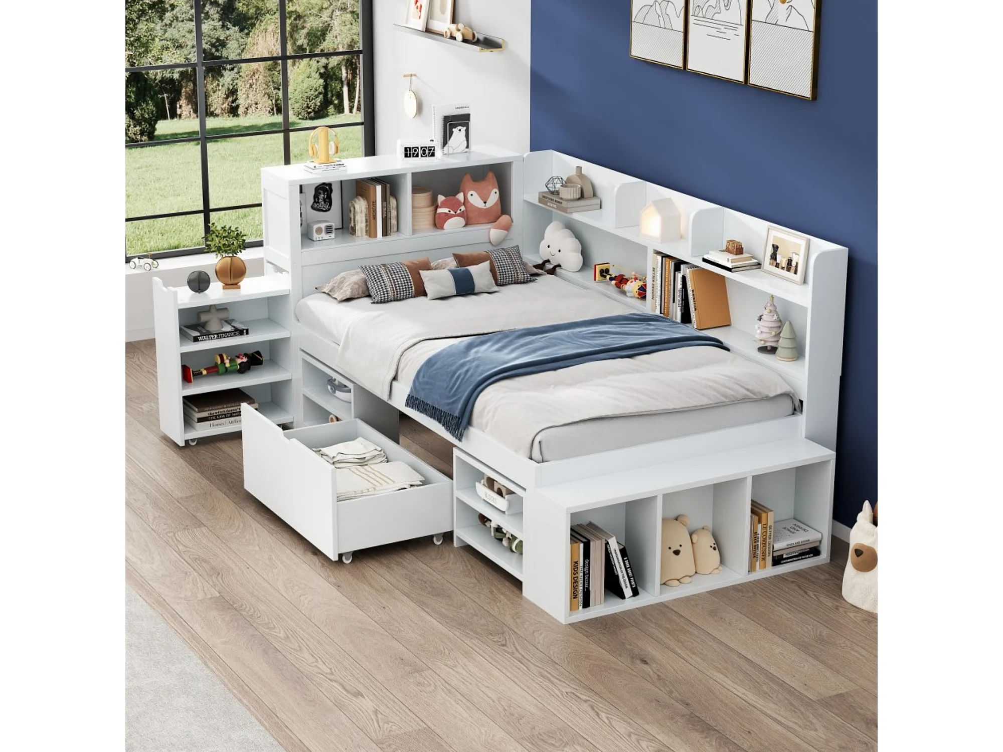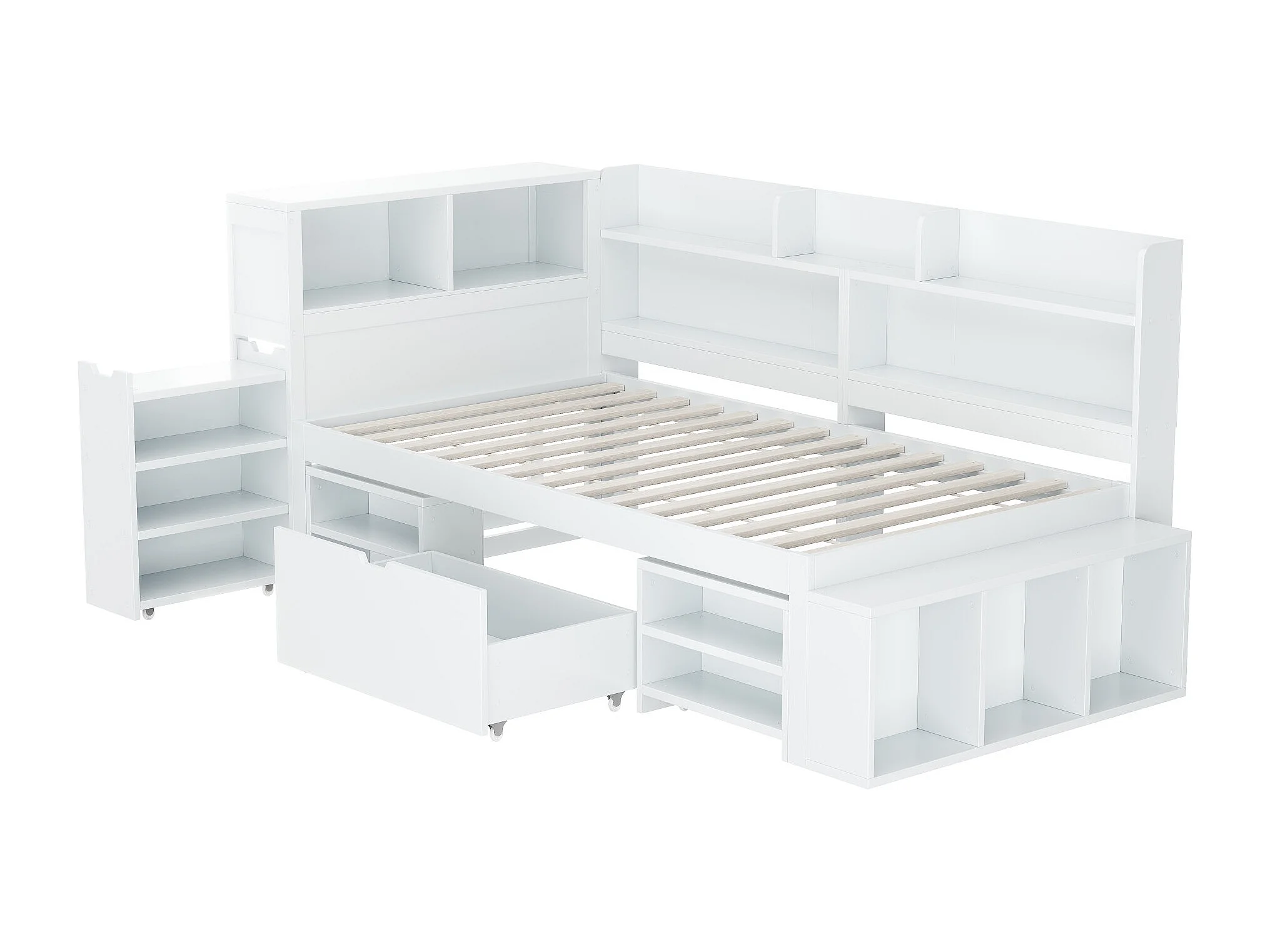 Lit enfant 90x200 cm bois avec tiroirs, étagères et rangement multifunzione, bianco