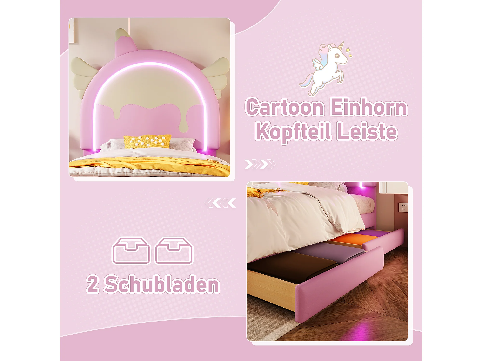 Lit enfant 90x200 cm in PU con LED, 2 cassetti, forme licorne, rosa, senza matelas