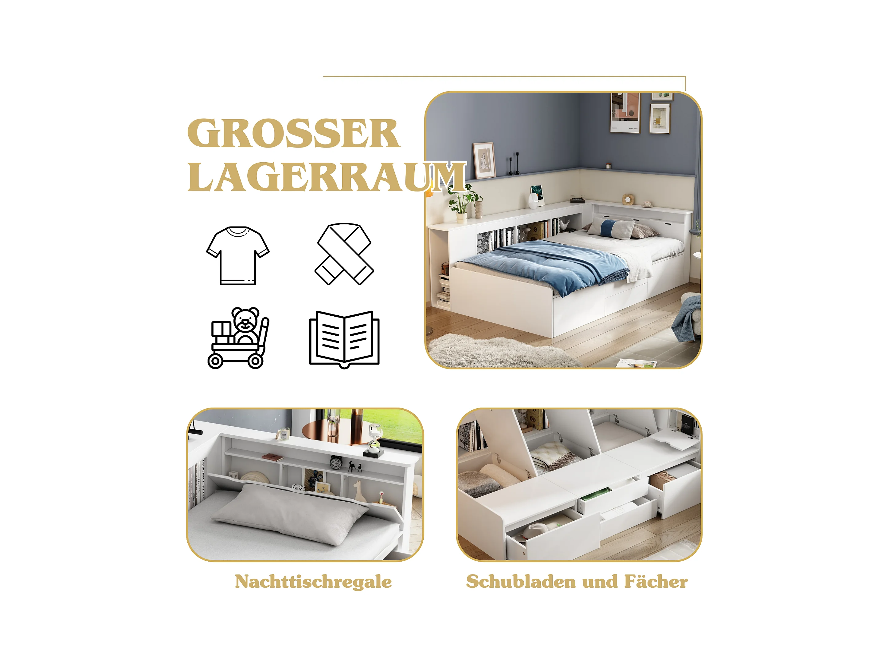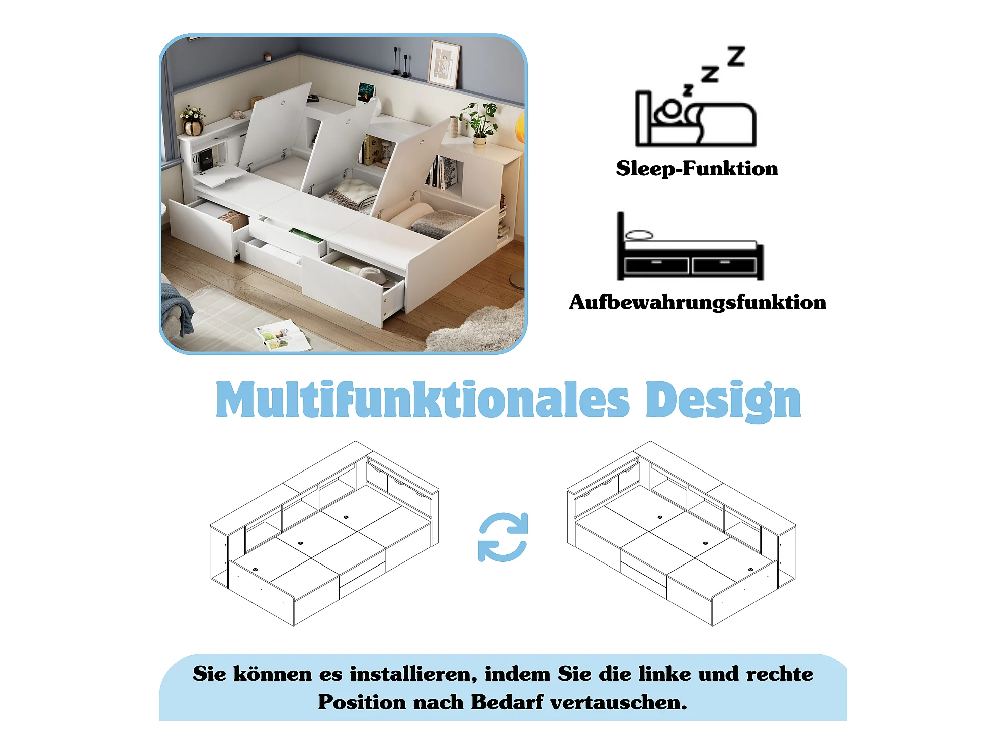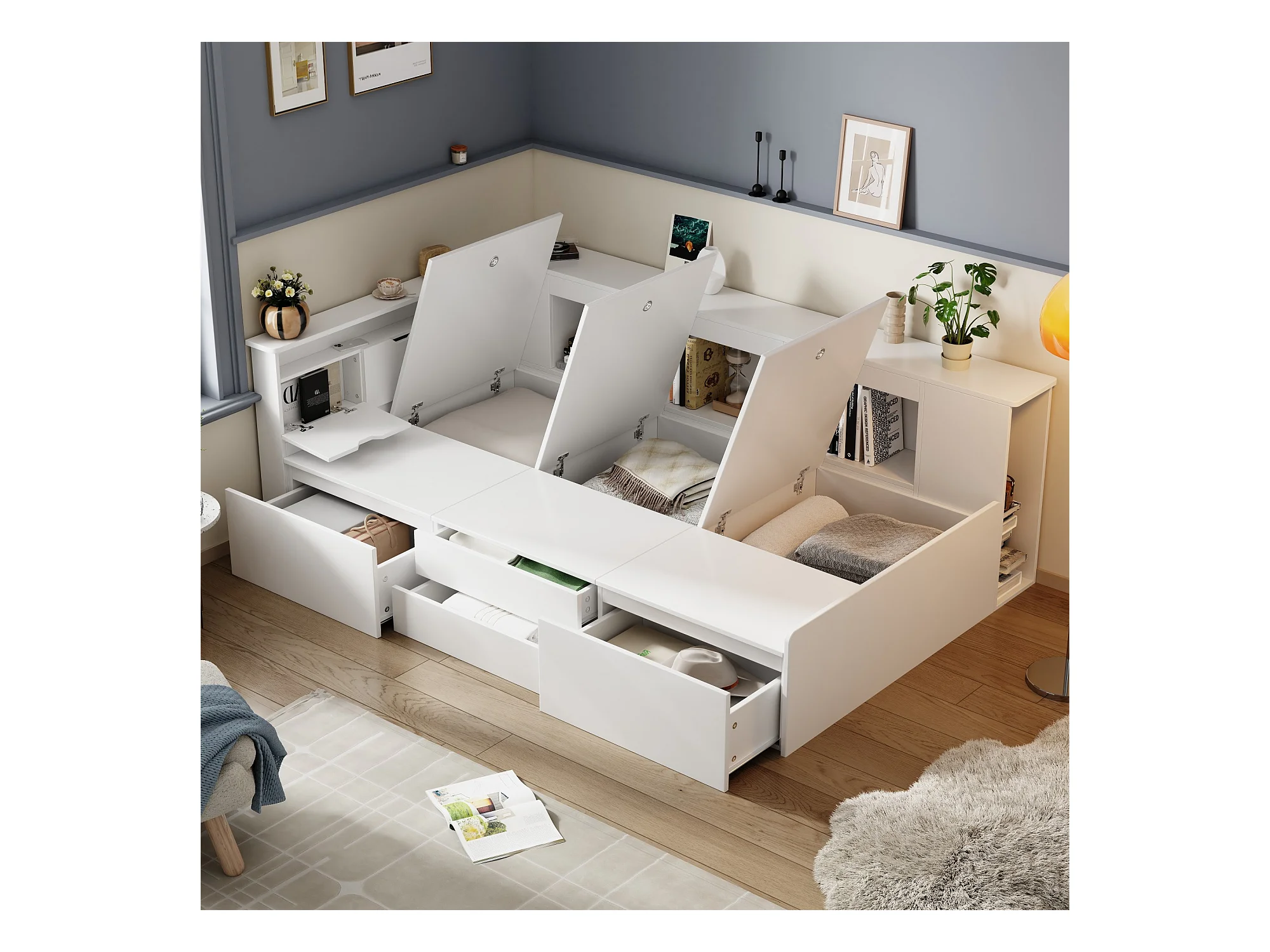 Lit enfant 90x200cm MDF bianco con cassetti biblioteca e rangements intégrés sans matelas