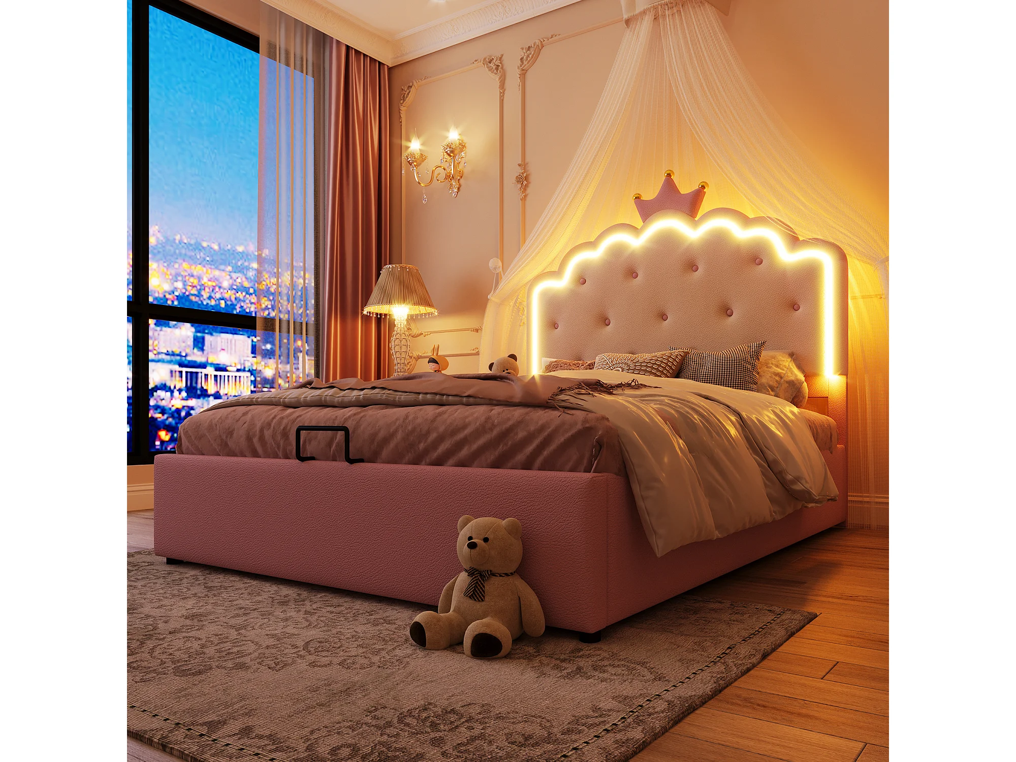 Lit enfant Princesse 140x200 cm PU LED rangement hydraulique chambre rose
