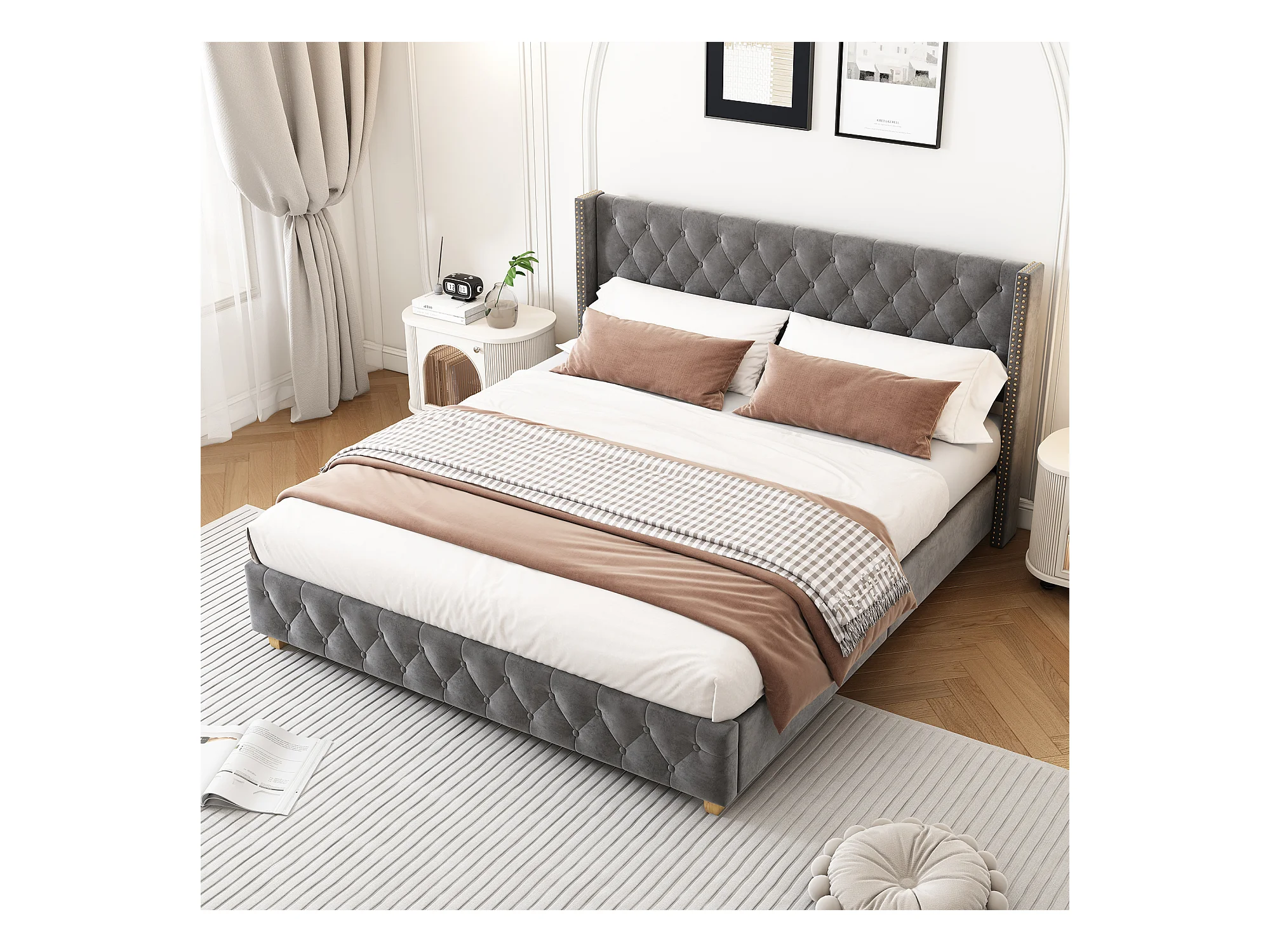 Lit rembourré 140x190 cm velluto grigio con tête de lit capitonnée e pieds en bois