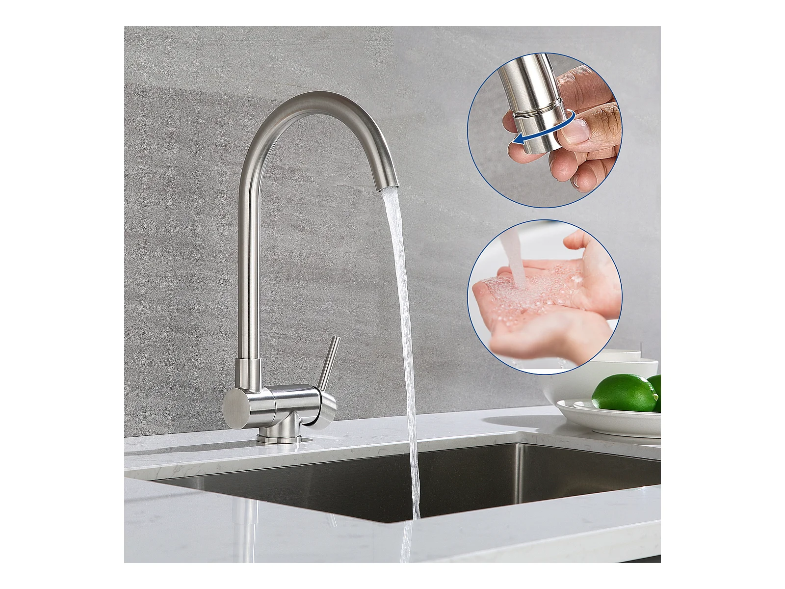 Miscelatore monocomando da cucina Cecipa max, 2 pezzi, rubinetto per lavello in acciaio inossidabile, rubinetti girevoli a 360° spazzolati, modello UE