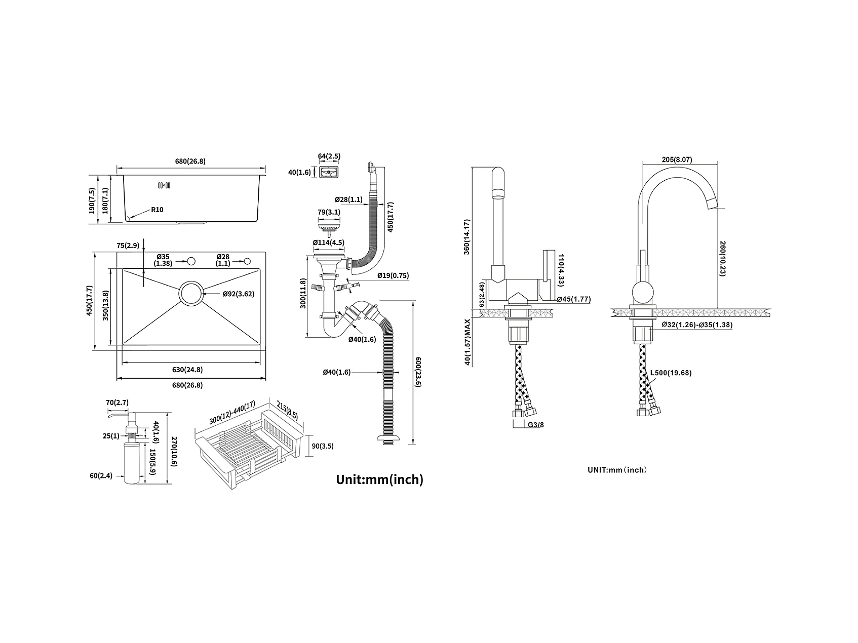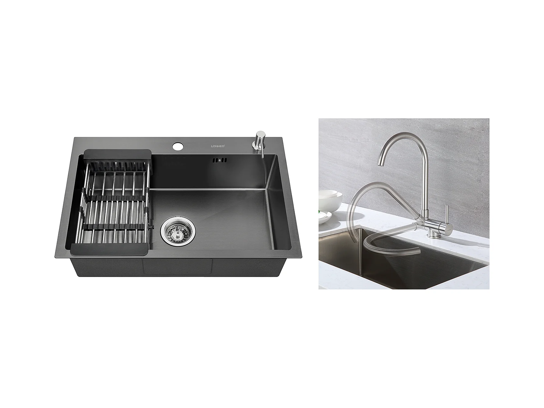 Lonheo Max Lavello Cucina Nero 68x45x19CM con Distributore di sapone e Scolapiatti cestino+Miscelatore Cucinain Acciaio Inox 304 Pieghevole Girevole