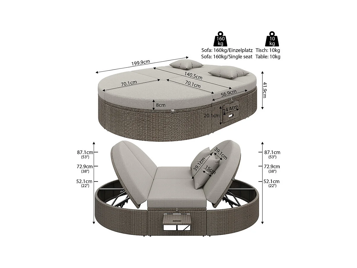 Lunga sedia doppia in rattan - Lunga sedia da giardino con telaio laterale - Angolo regolabile individualmente - Con cuscini - 2 posti - Grigio