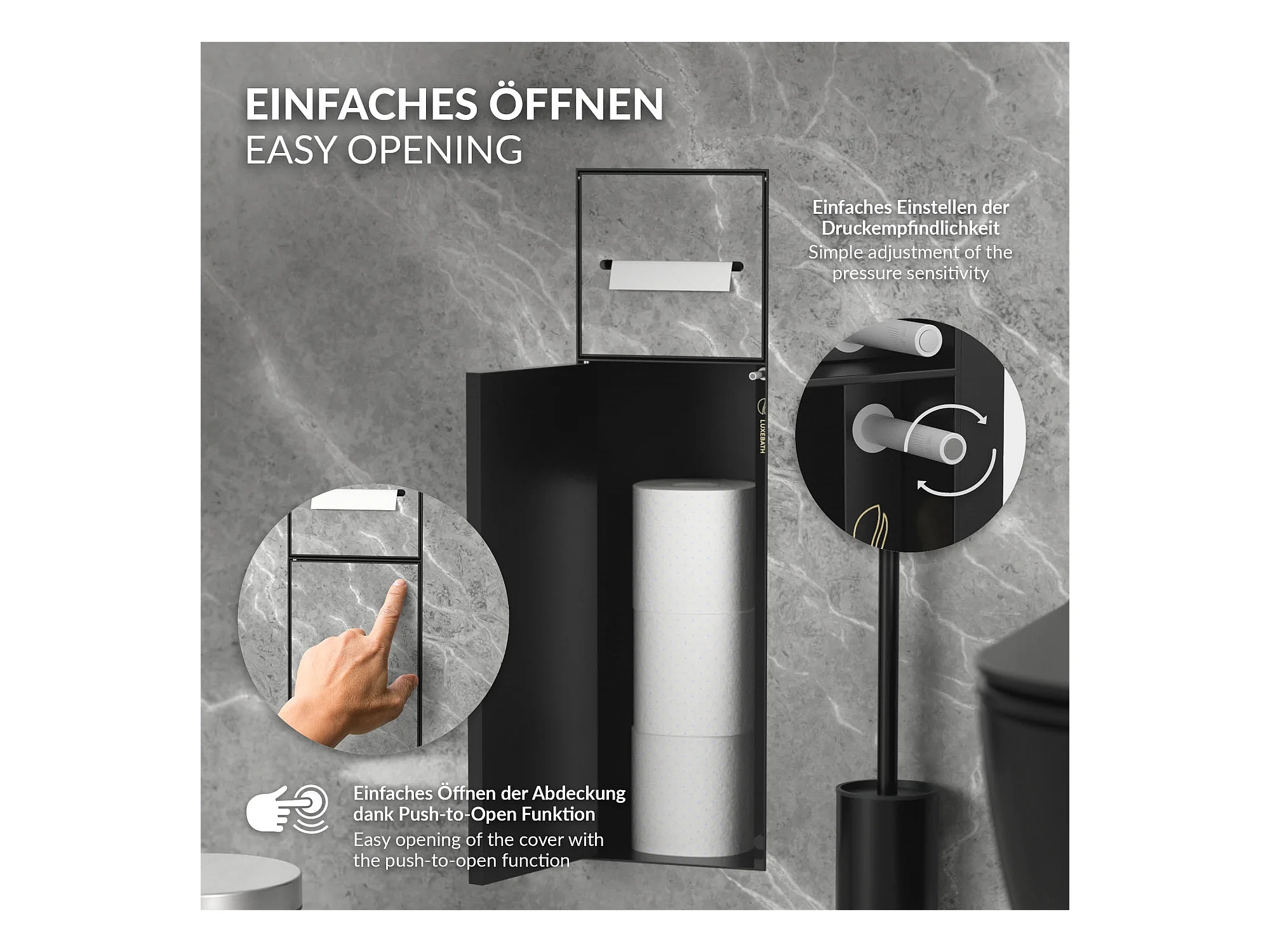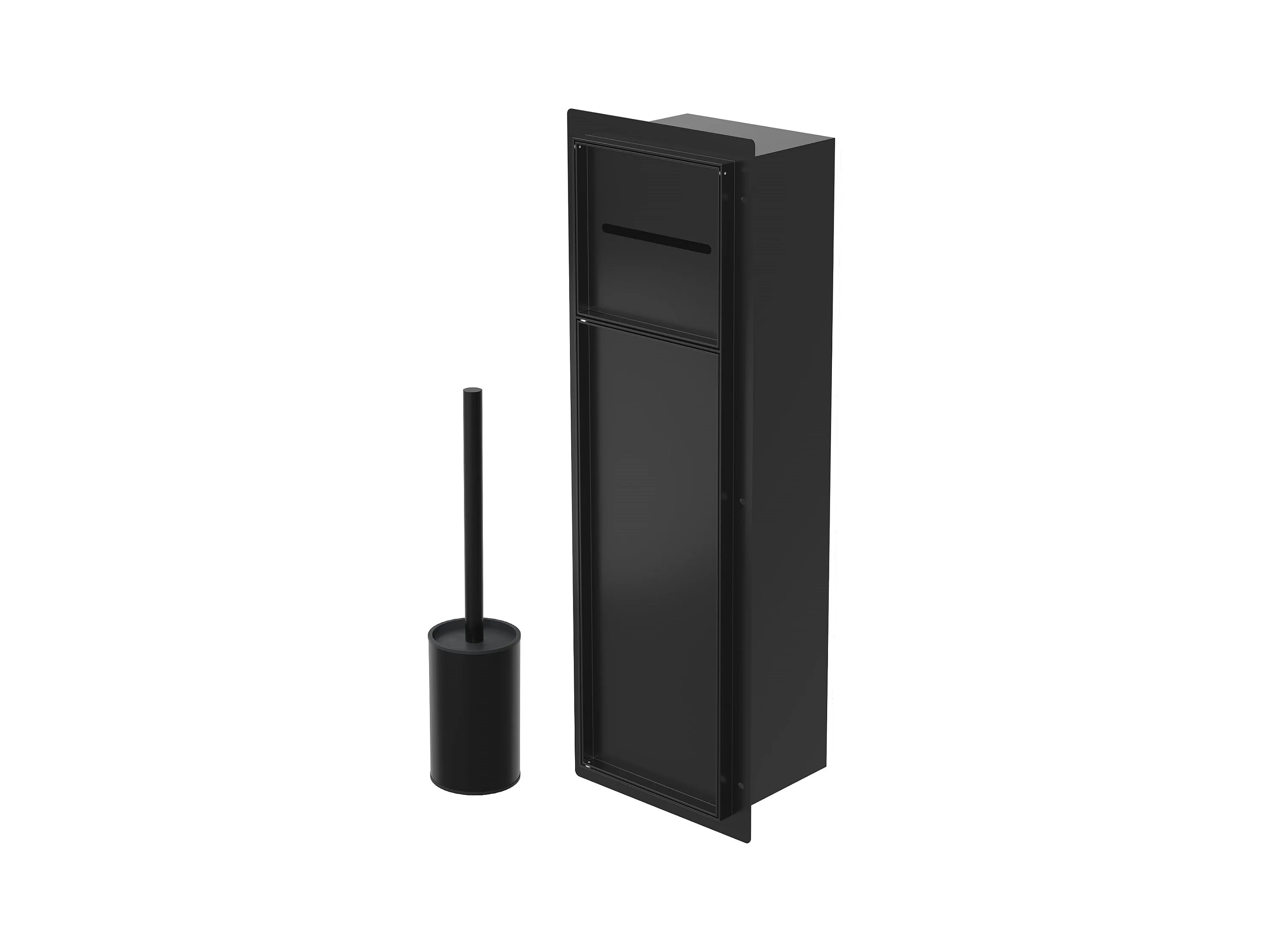 LuxeBath Porta carta igienica da incasso in acciaio inox verniciato a polvere nero opaco con scopino e vano portaoggetti, modulo WC a nicchia