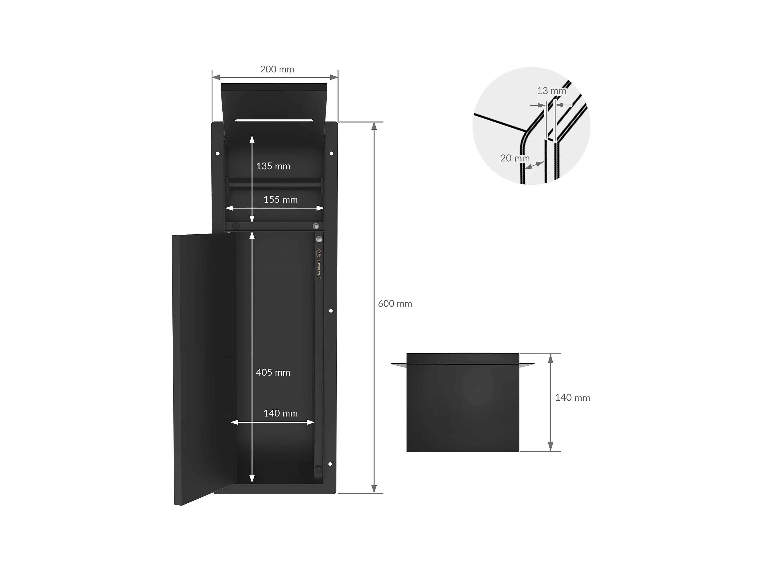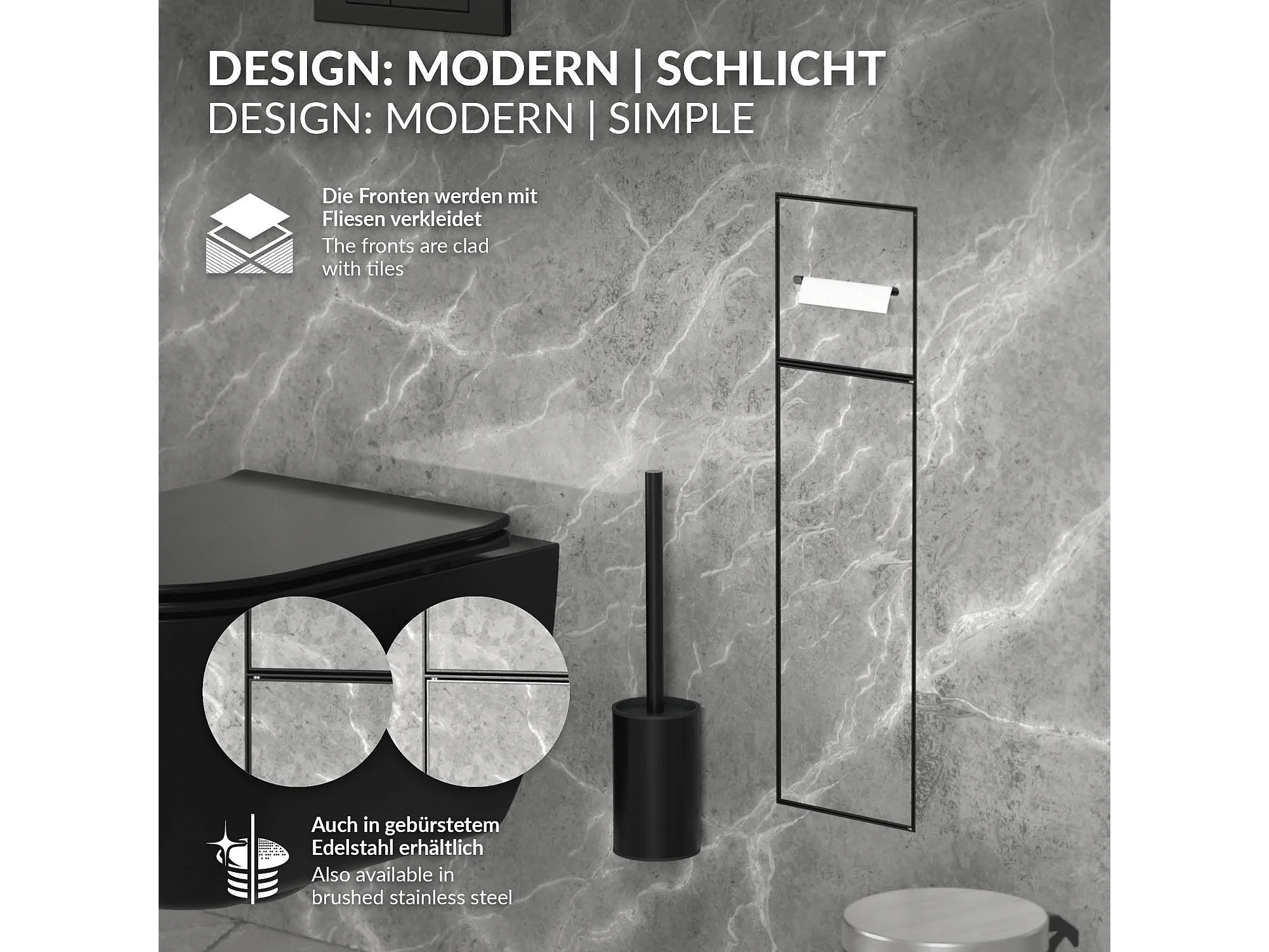 LuxeBath Porta carta igienica da incasso chiuso in acciaio inox verniciato a polvere nero opaco con scopino e vano portaoggetti, modulo WC a nicchia