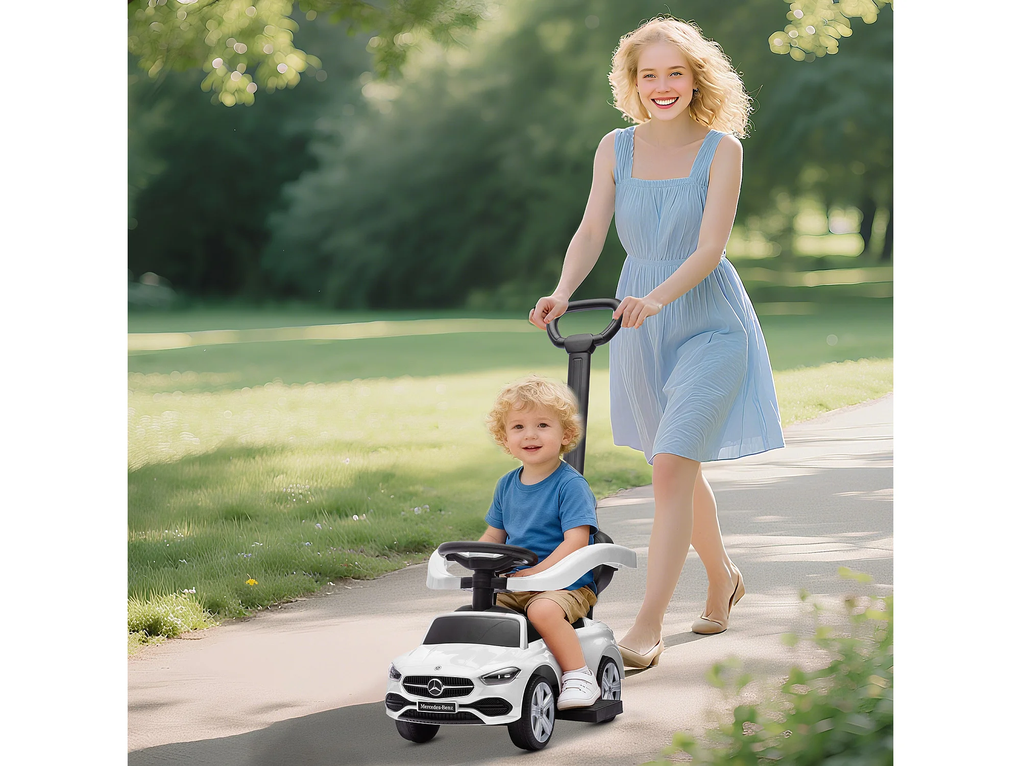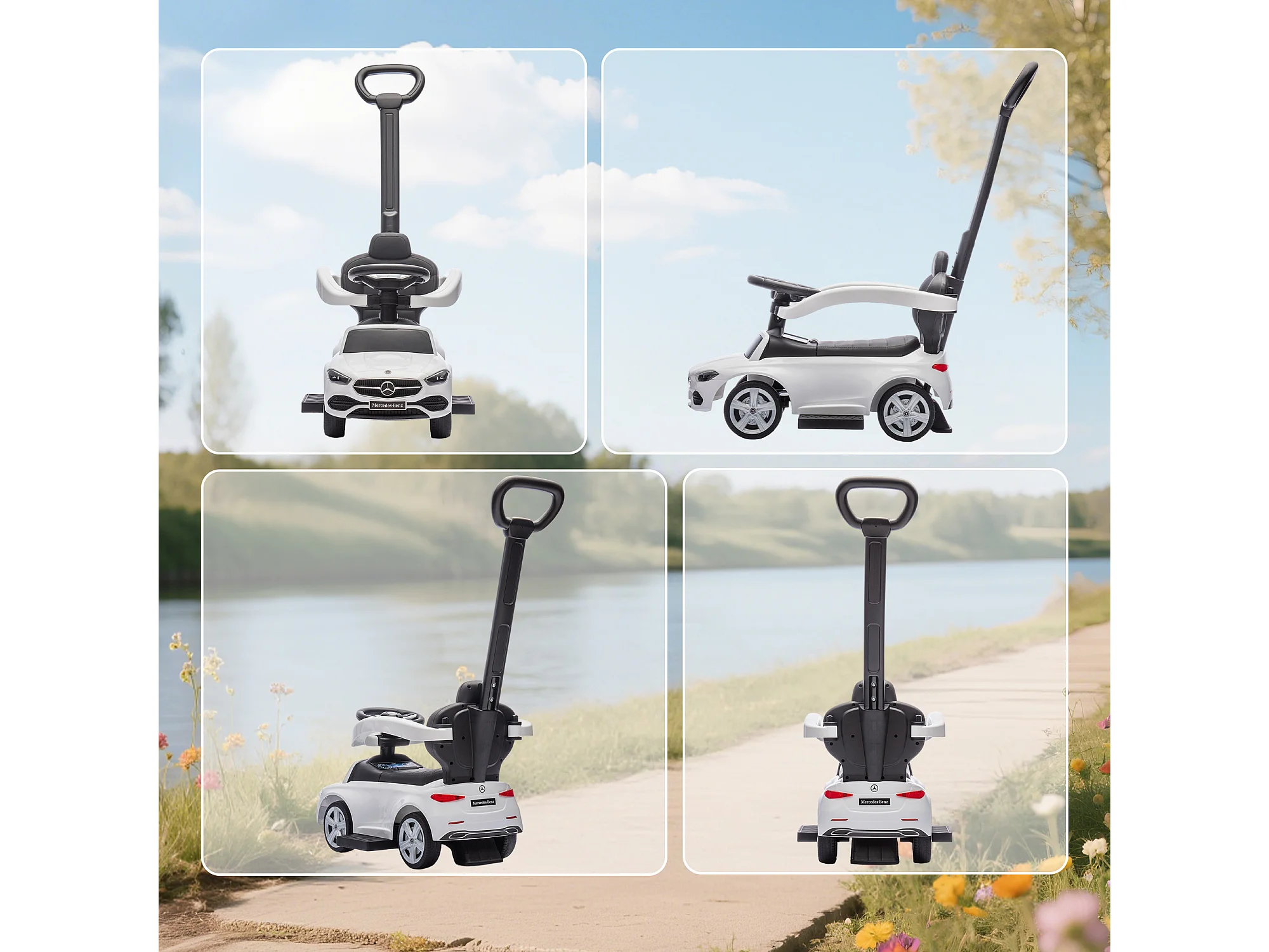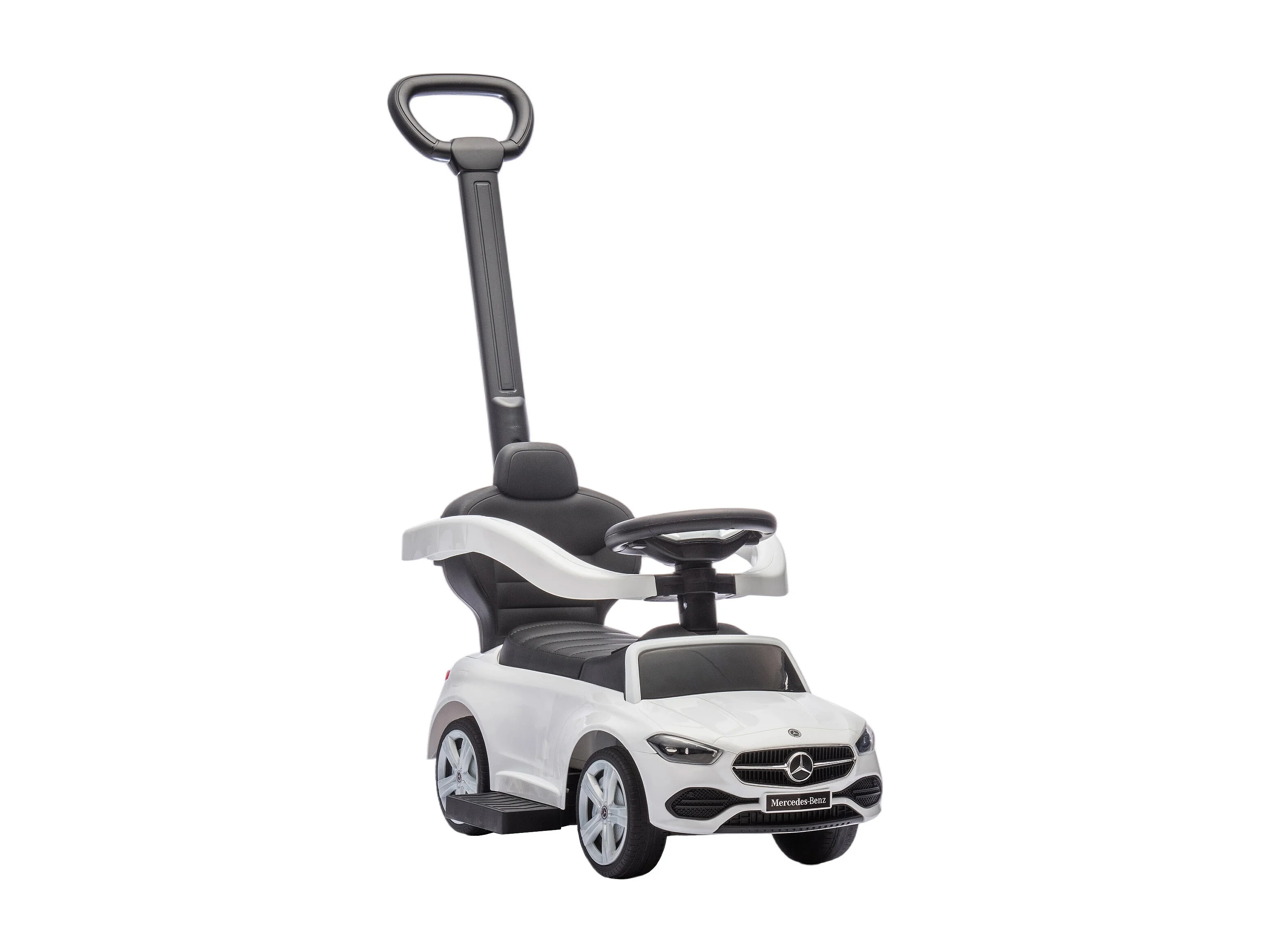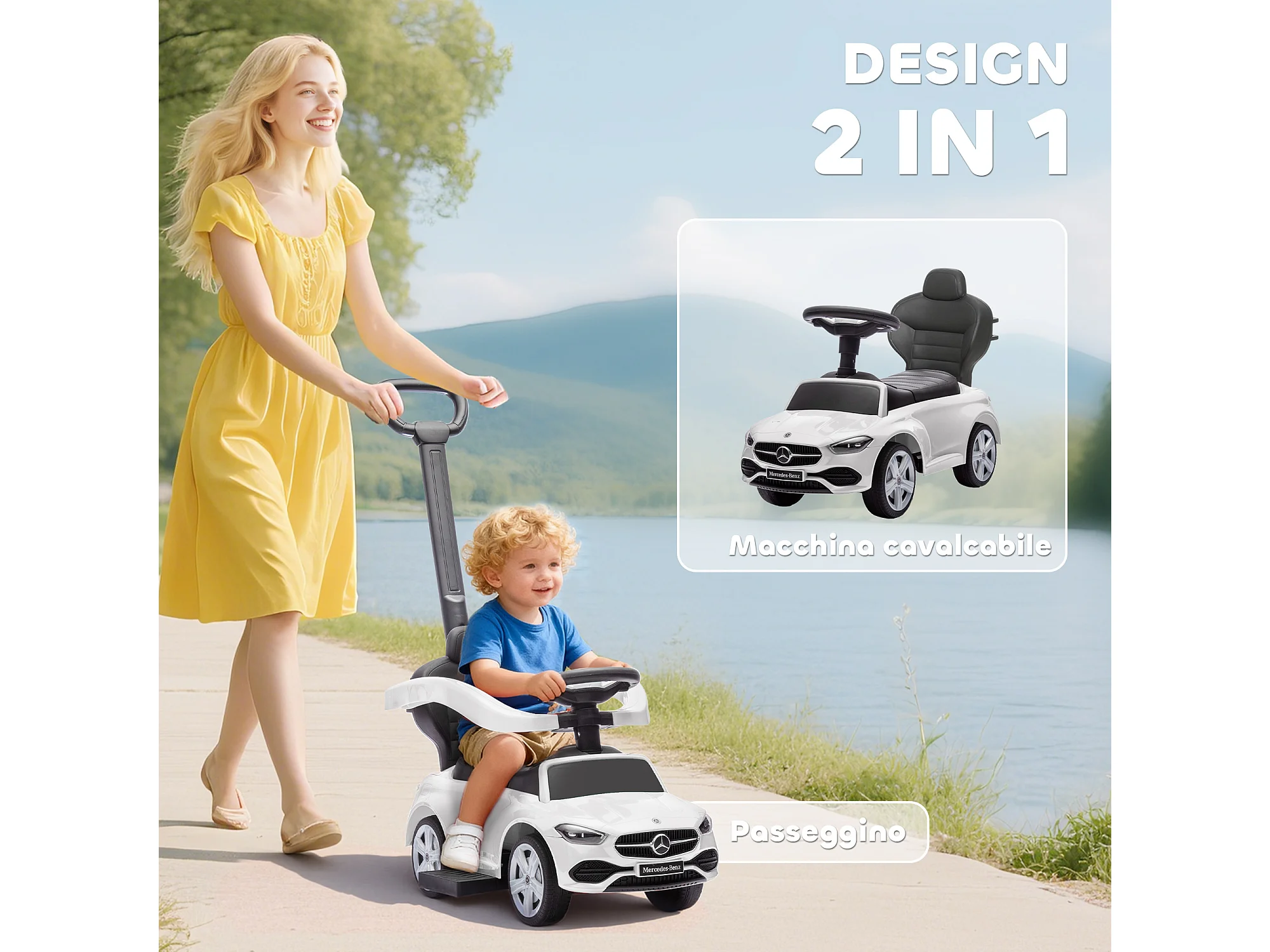 Macchina cavalcabile per bambini convertibile in passeggino bianco