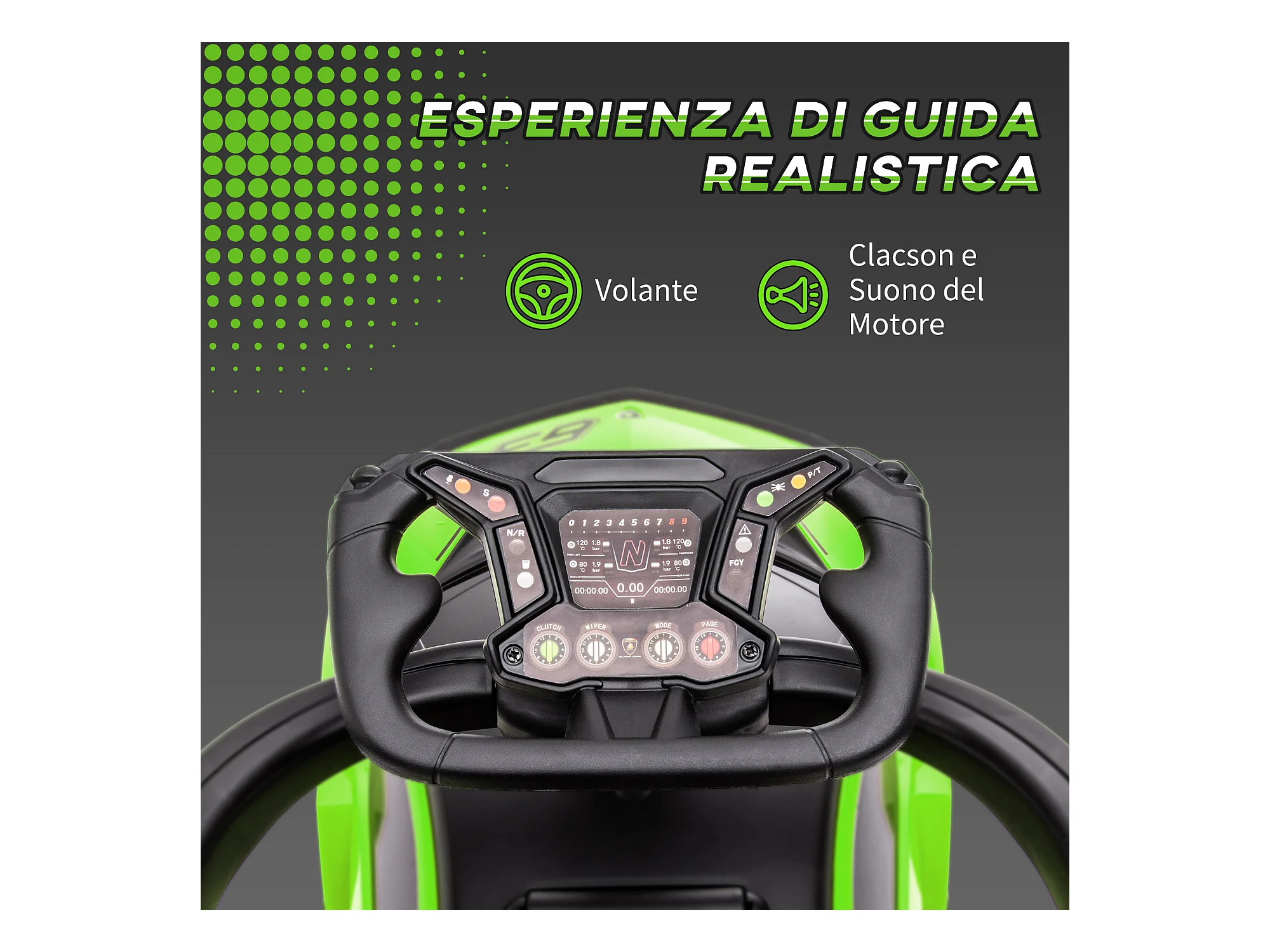 Macchina giocattolo per bambini cavalcabile con volante e fari