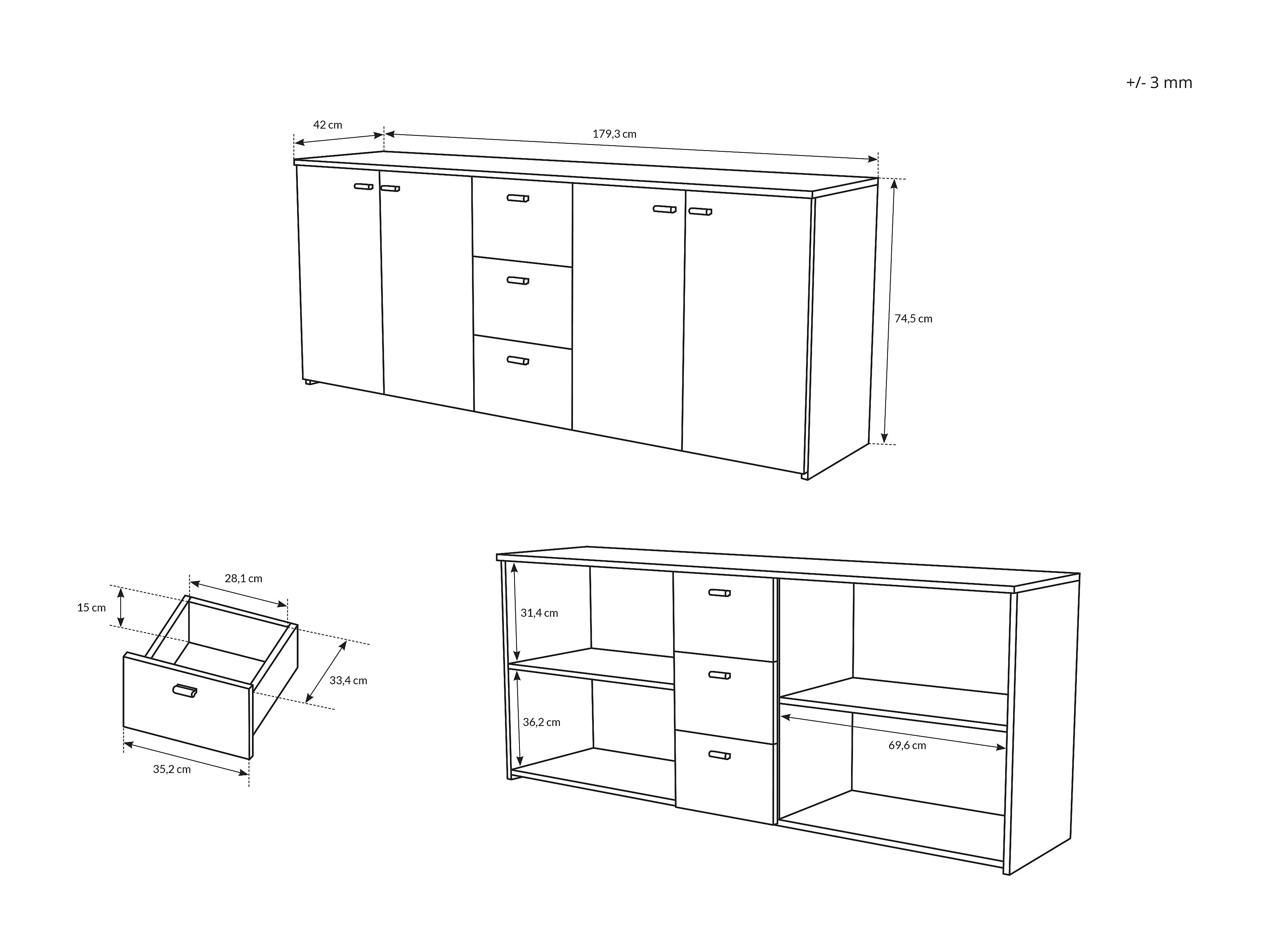 Madia moderna 180x74cm con 4 ante e 3 cassetti rovere chiaro MALK10
