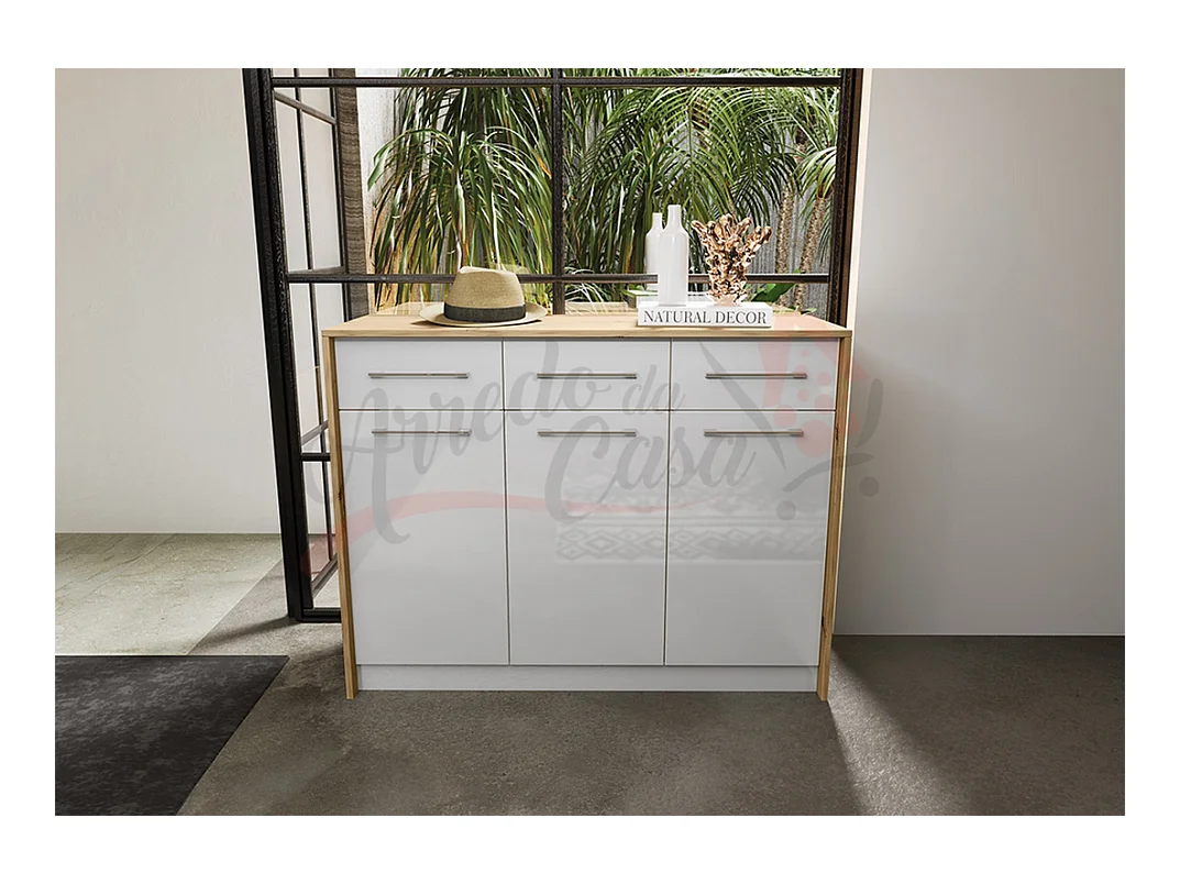 Madia con due ante e tre cassetti per cucina o ingresso MI9 135x75 bianco lucido e rovere grigio