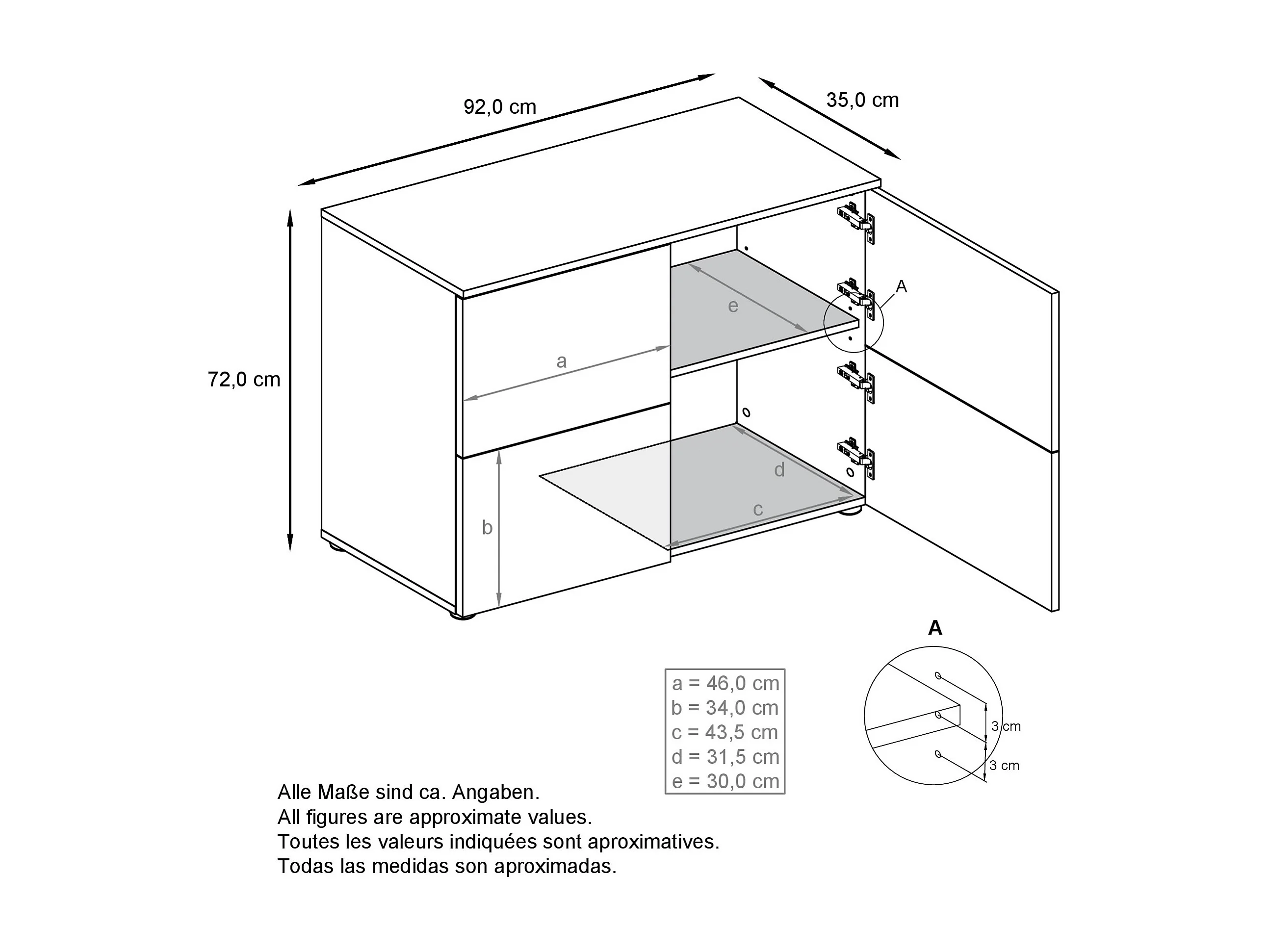 Credenza Cassettiera Sylt, struttura in nero opaco / frontale in bianco opaco con compensazioni in bianco lucido (139 x 72 x 35)