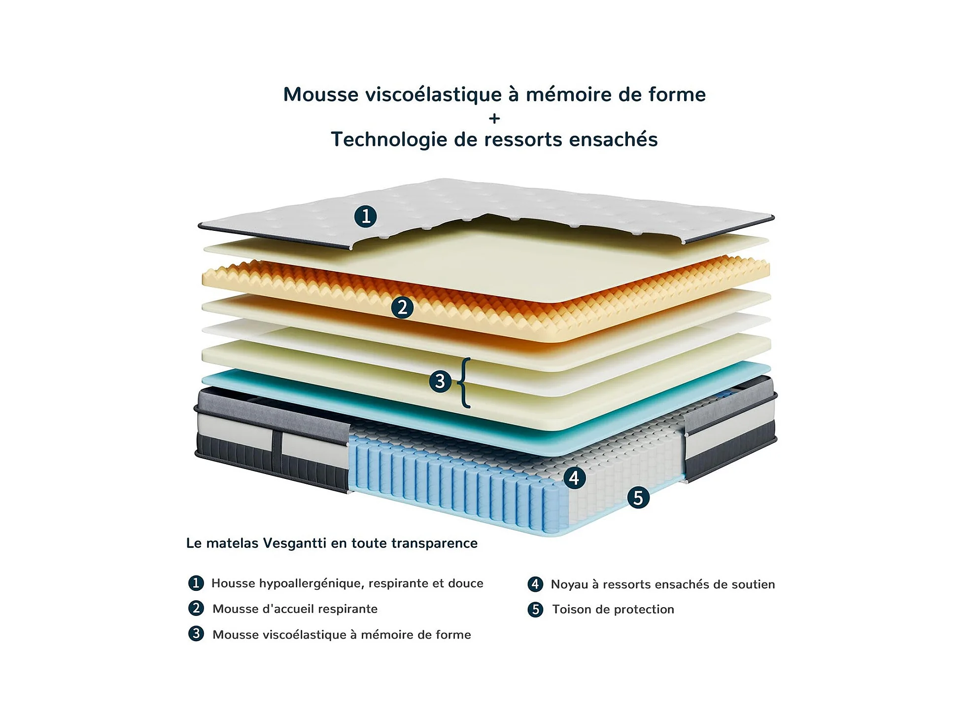 Materasso Vesgantti Grey 90x190cm, 25cm di spessore, molle insacchettate ibride e memory foam, 7 zone di comfort, multistrato, certificato Oeko-Tex