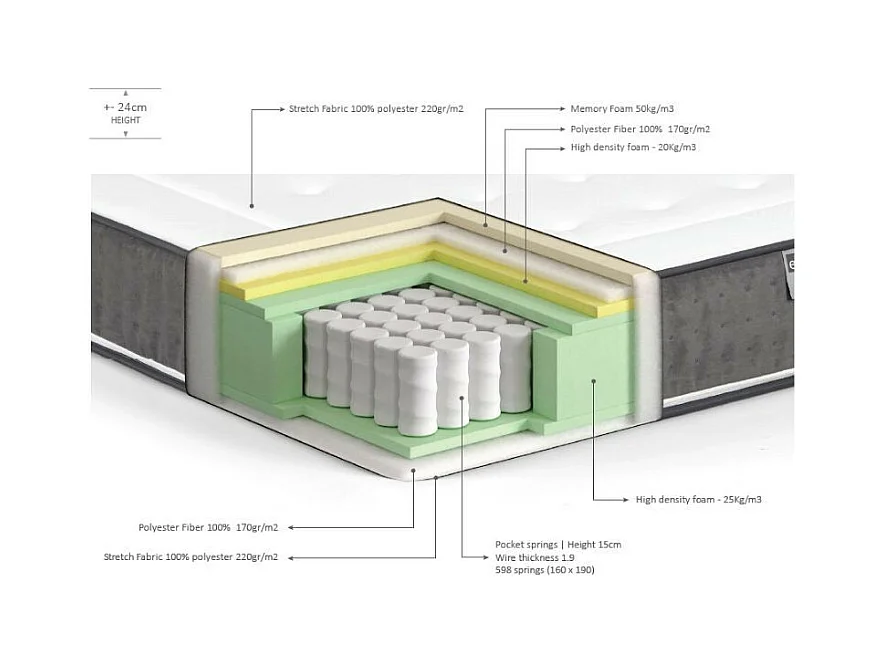 Materasso matrimoniale 160x190x23H Raptor con tessuto trapuntato e molle insacchettate