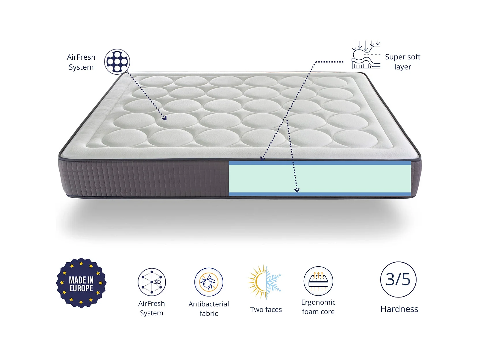 Materasso Una Piazza e Mezza 120X200 CAELUM, Alto 24 CM, Schiuma ad alta densità. Media compattezza