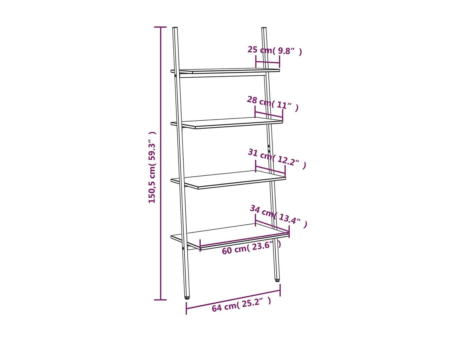 Mensola inclinata a 4 ripiani marrone chiaro e nero 64x34x150,5 cm