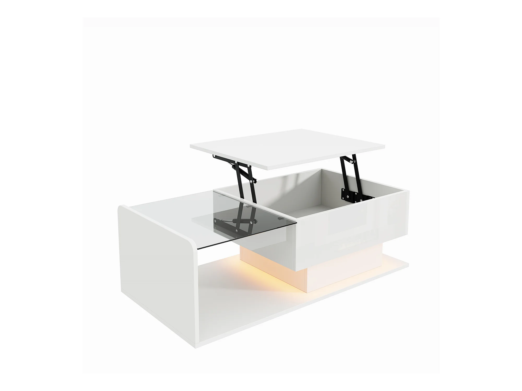 Mesa de centro elevable blanca con LED, tapa de cristal y almacenaje 100x50x33/47,5cm
