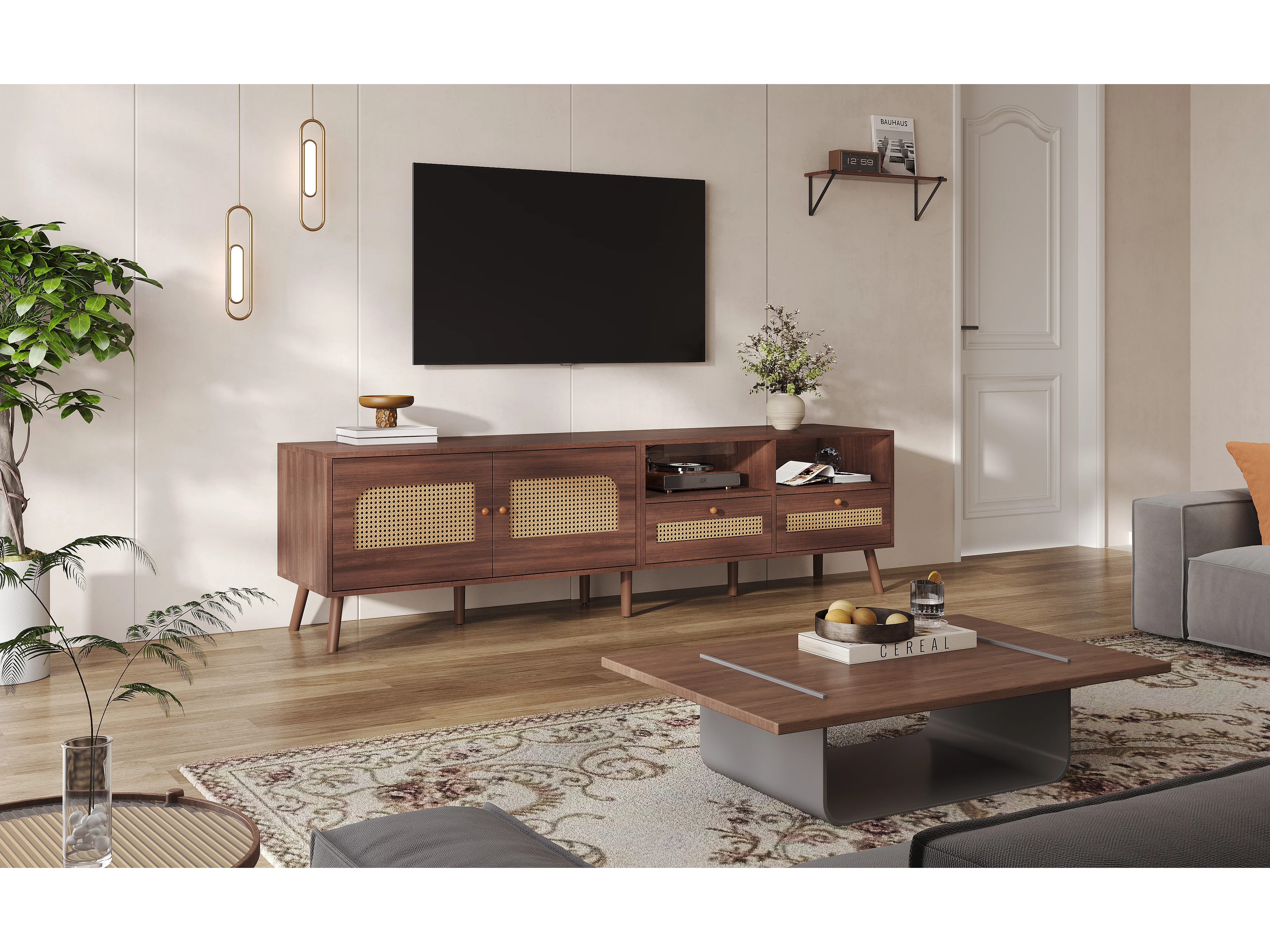 Meuble TV 200 cm Brun 2 Portes Rotin 2 Tiroirs 8 Pieds pour Téléviseur 80 Pouces Salon