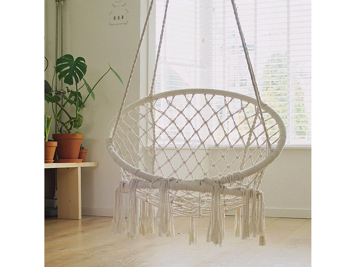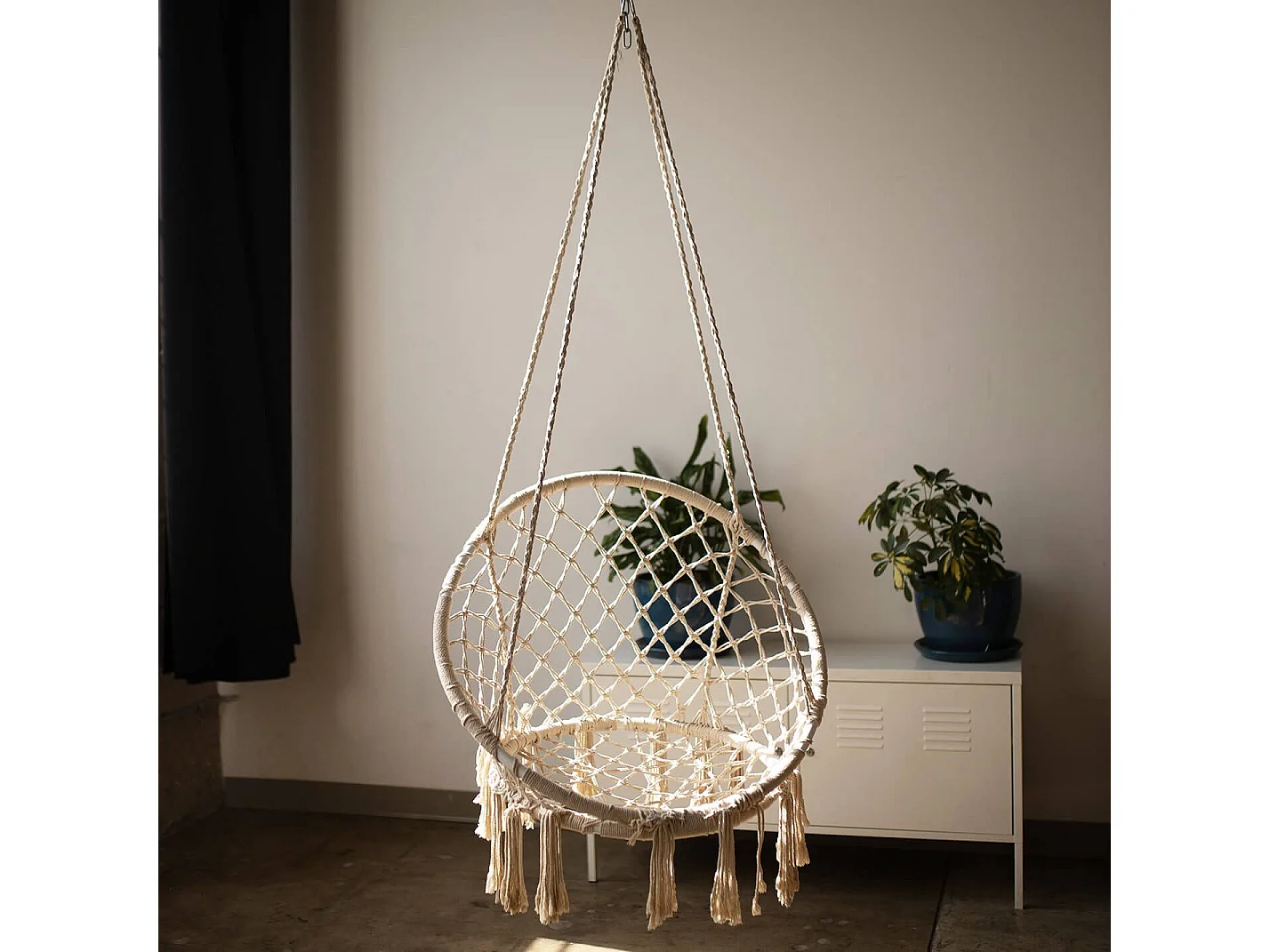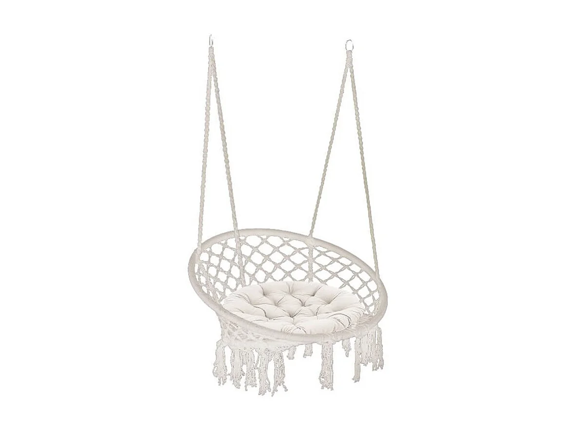 Poltrona Sospesa Pensile Da Giardino Con Corda Cotone Effetto Macramè Struttura In Acciaio Cuscino Sedia Dondolo Amaca Seduta Imbottita Terrazzo Fino A 160 Kg Beige