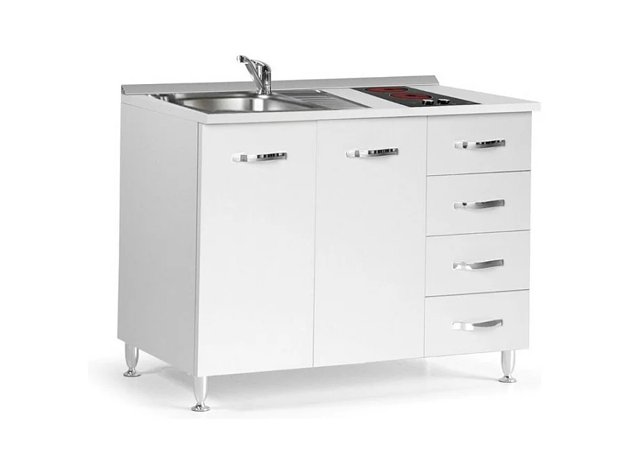 Mini cucina Cucinino120 con cassetti bianco larice lavello e piano cottura vetroceramica 120x60x85H