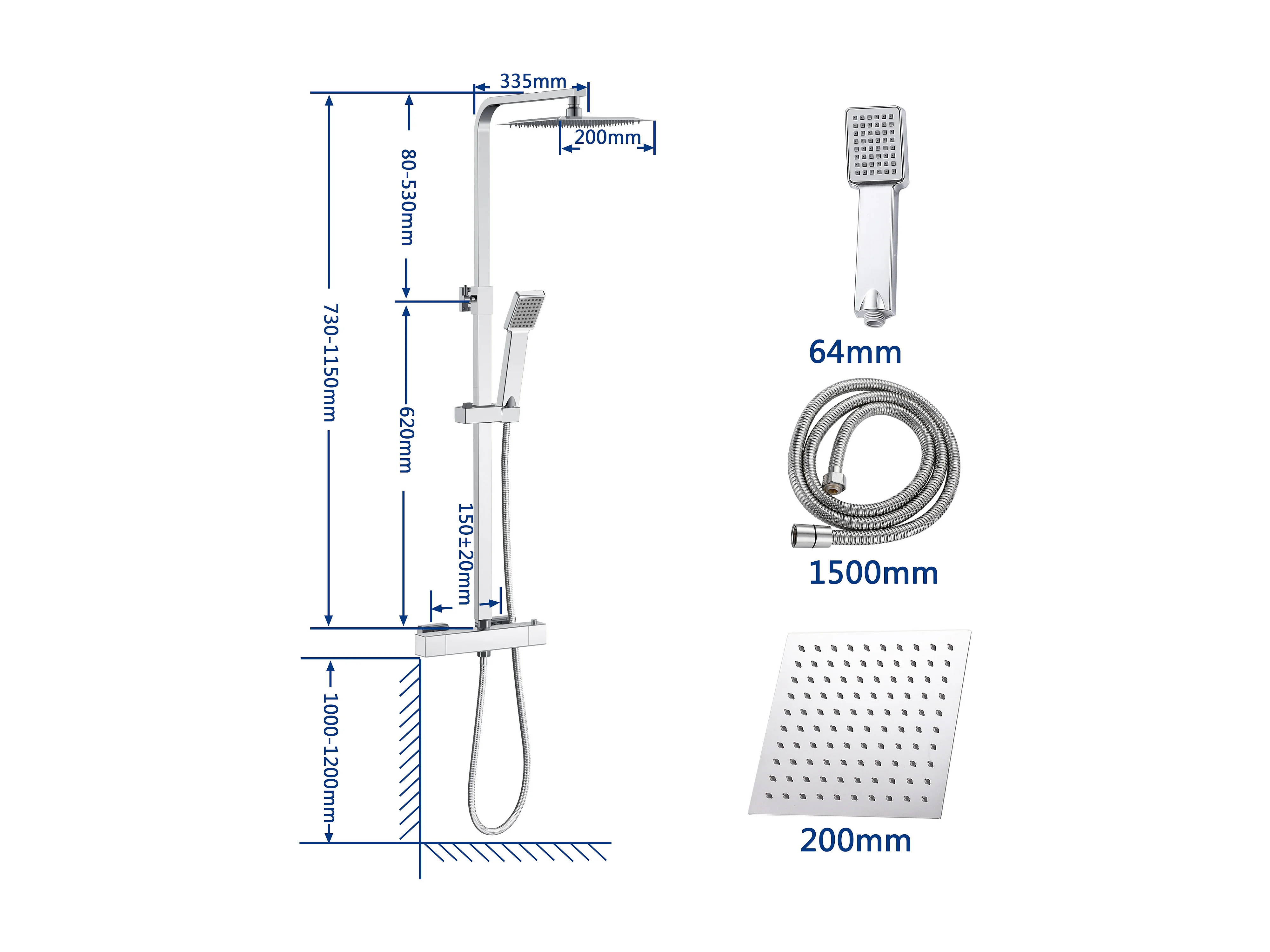 Colonna doccia idromassaggio con rubinetto termostatico, soffione doccia quadrato 20x20cm in acciaio inox, cromato lucido