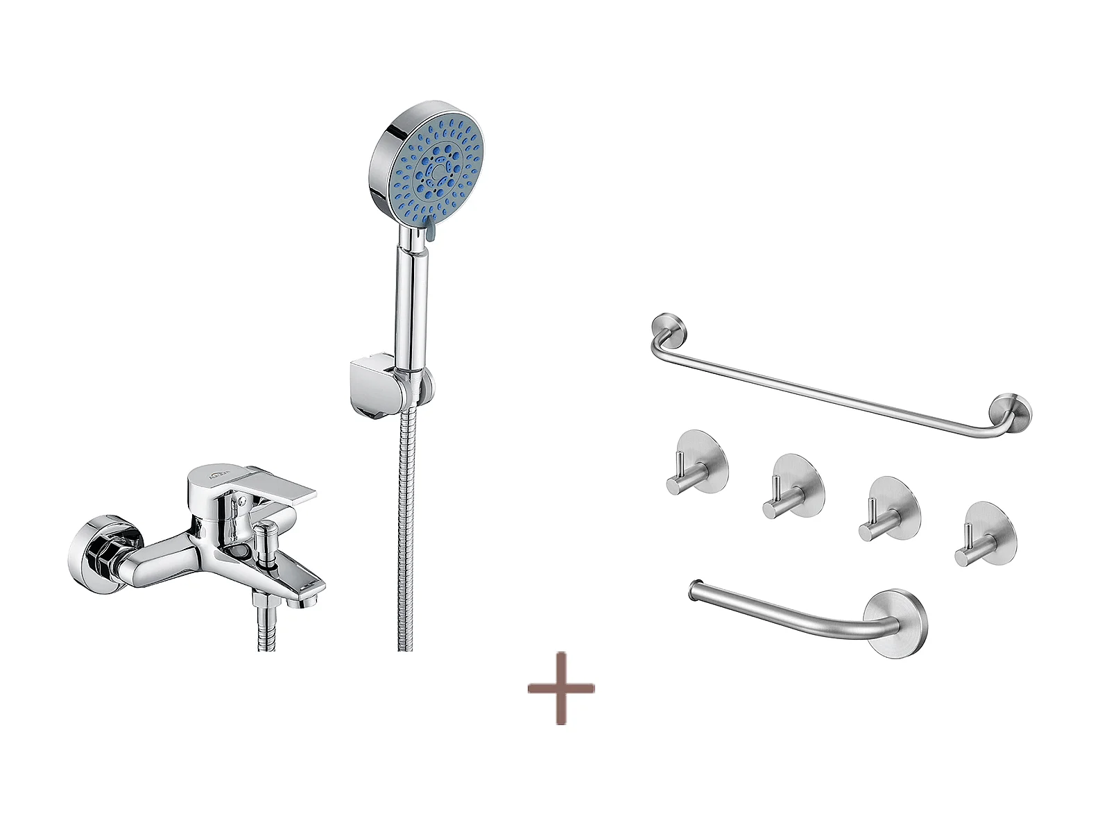 Miscelatore per Vasca Cromato,con Doccetta 5 Getti/Flessibile Doccia (1.5m) Supporto+Set Bagno Accessorio 6 Pezzi,Acciaio Inox,Spazzolato