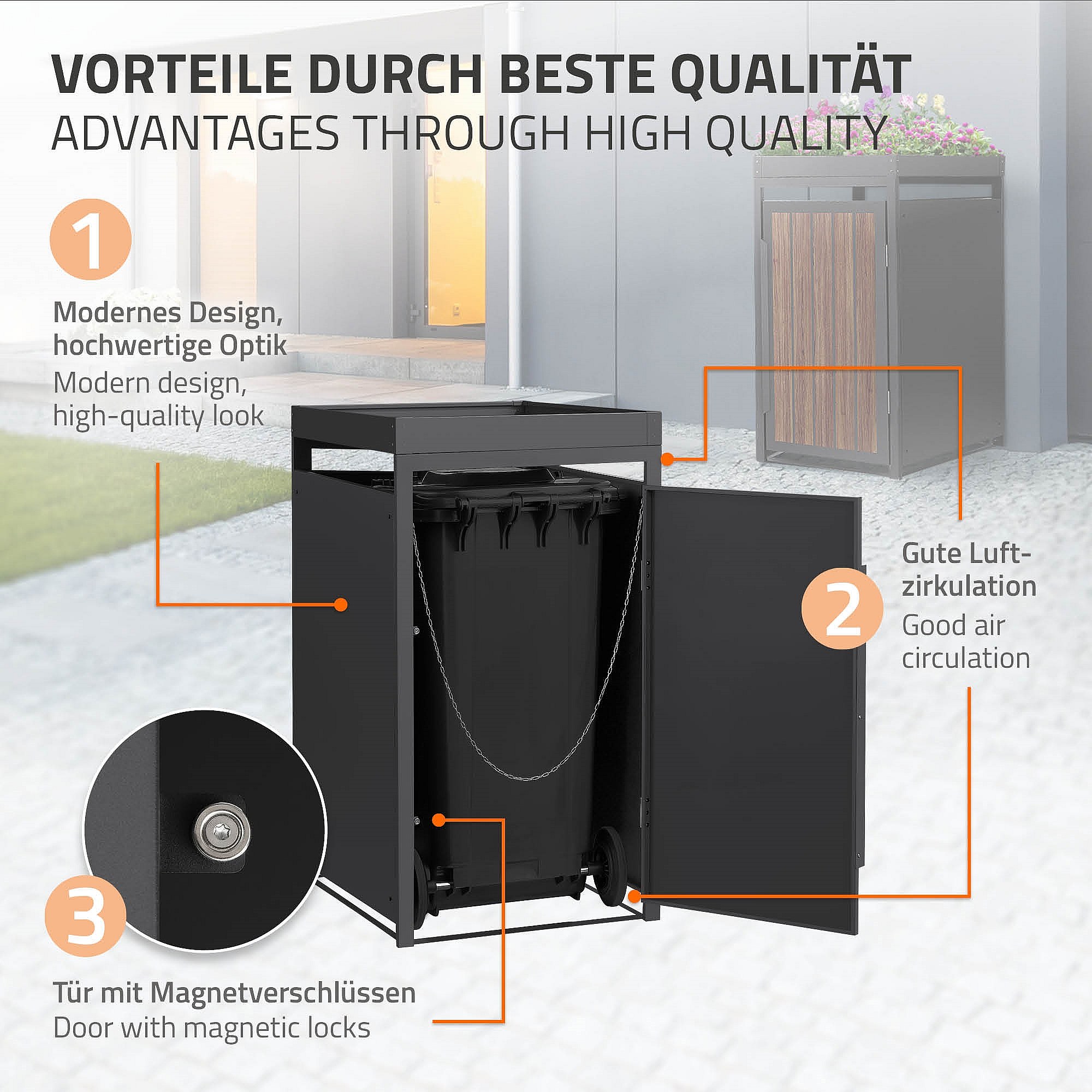 ML-Design Copribidone spazzatura 1 bidone 240L in acciaio antracite effetto legno con porta e tetto a fioriera, pattumiera da esterno, deposito bidoni