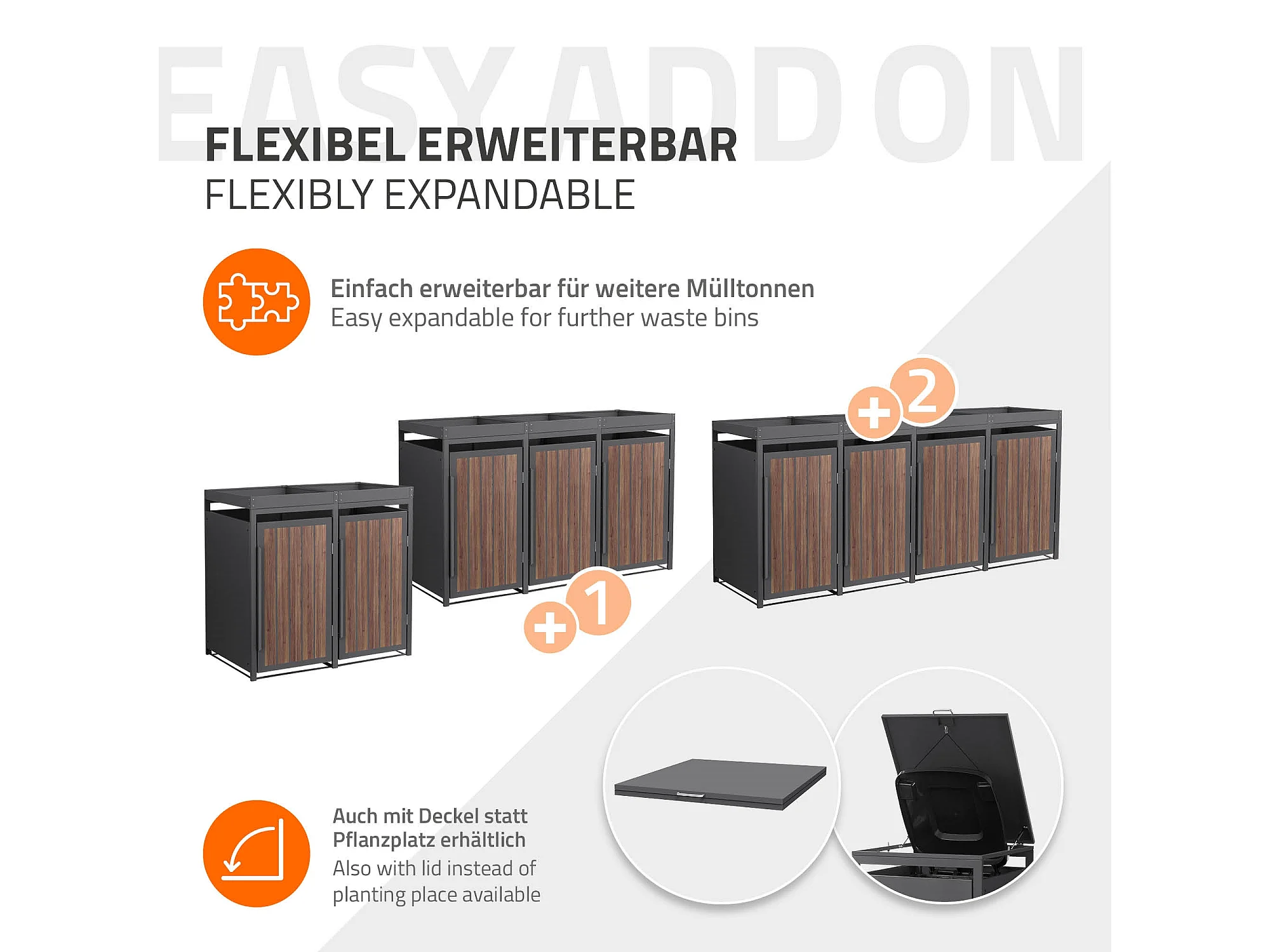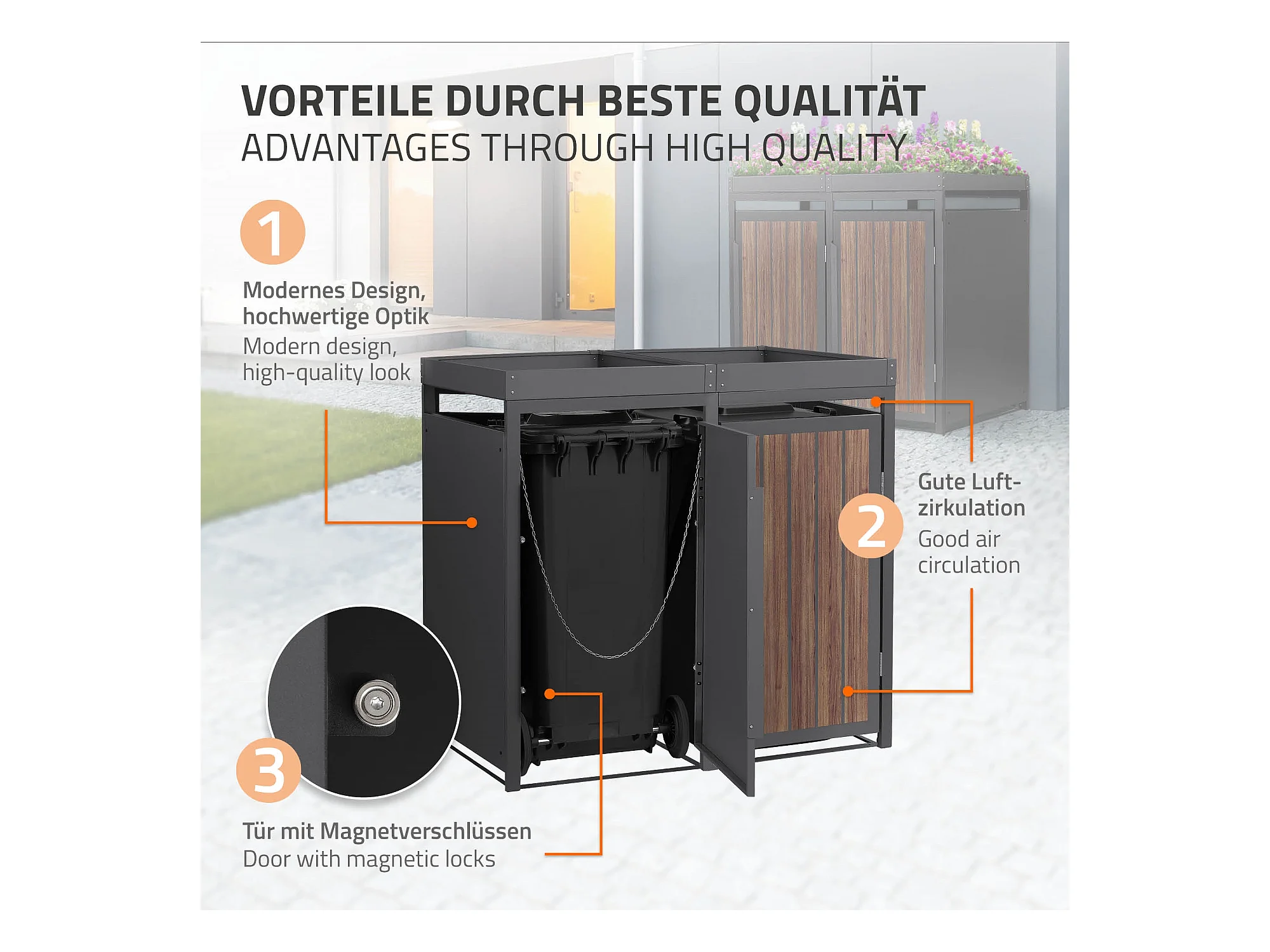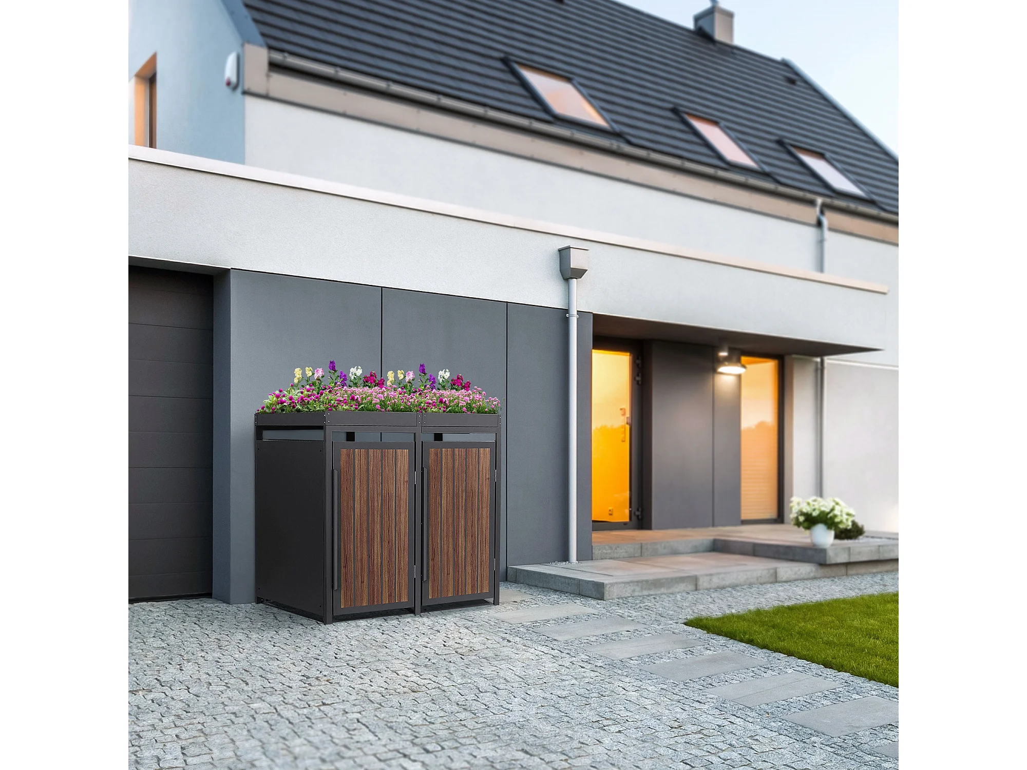 ML-Design Copribidone per spazzatura 2 bidoni 240L acciaio antracite rovere scuro, porta e tetto a fioriera, pattumiera esterno resistente intemperie