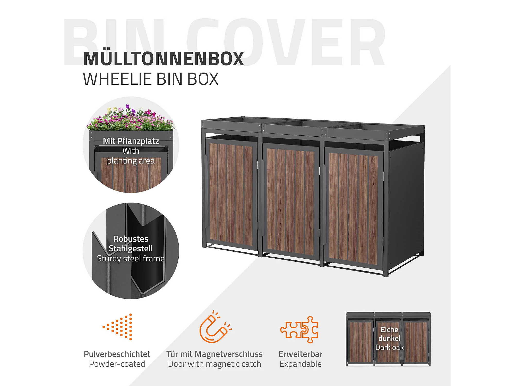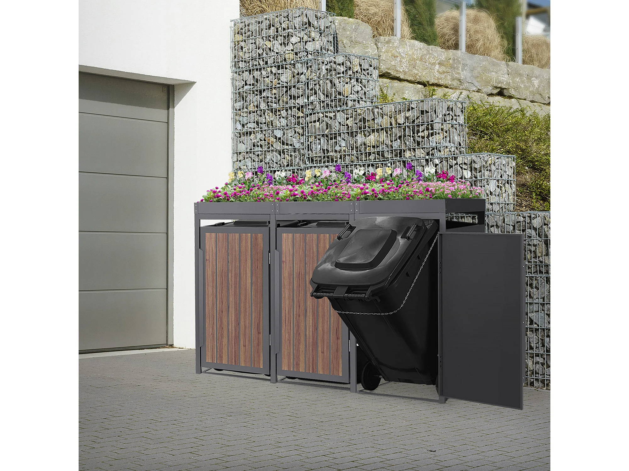 ML-Design Copribidone per spazzatura 3 bidoni 240L acciaio antracite rovere scuro, porta e tetto a fioriera, pattumiera esterno resistente intemperie