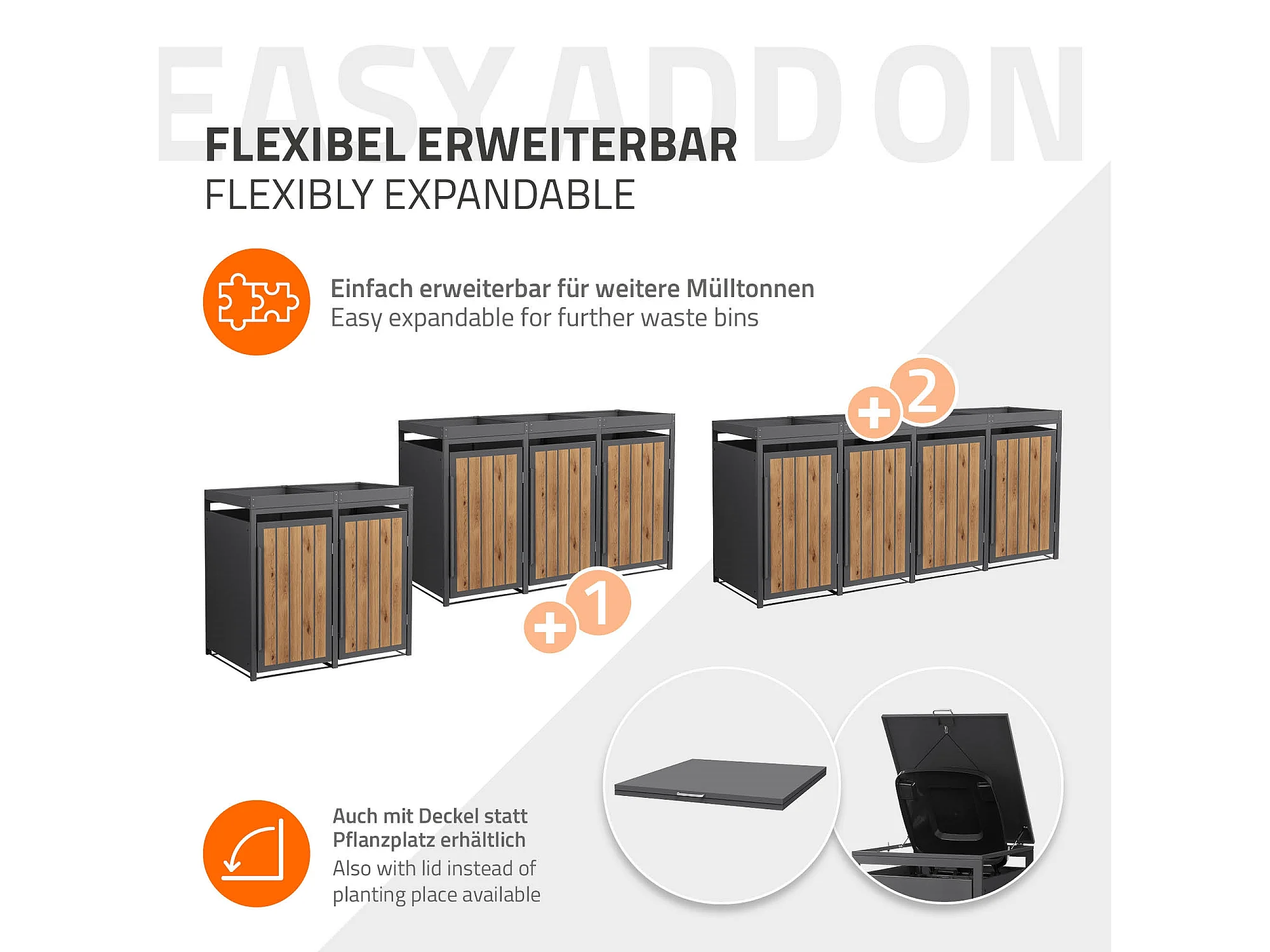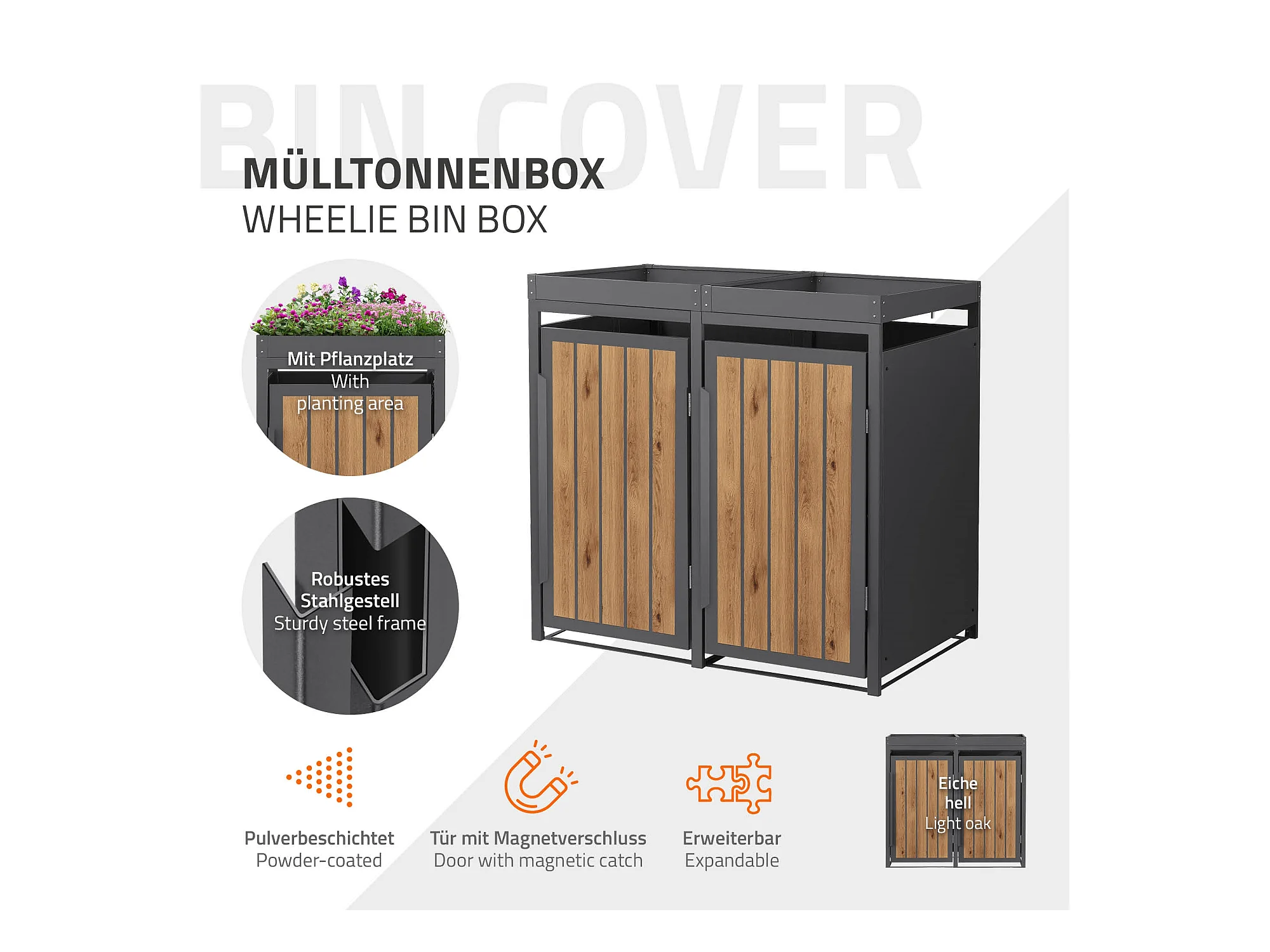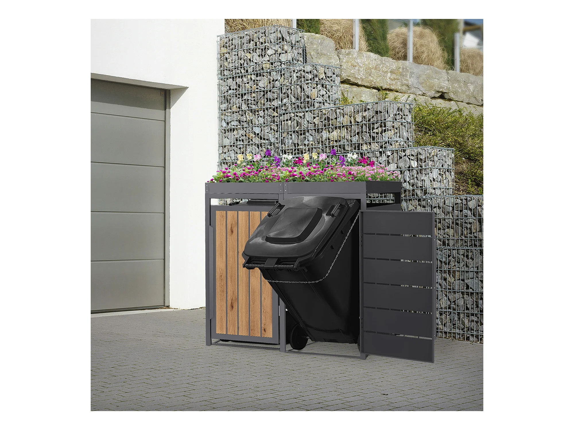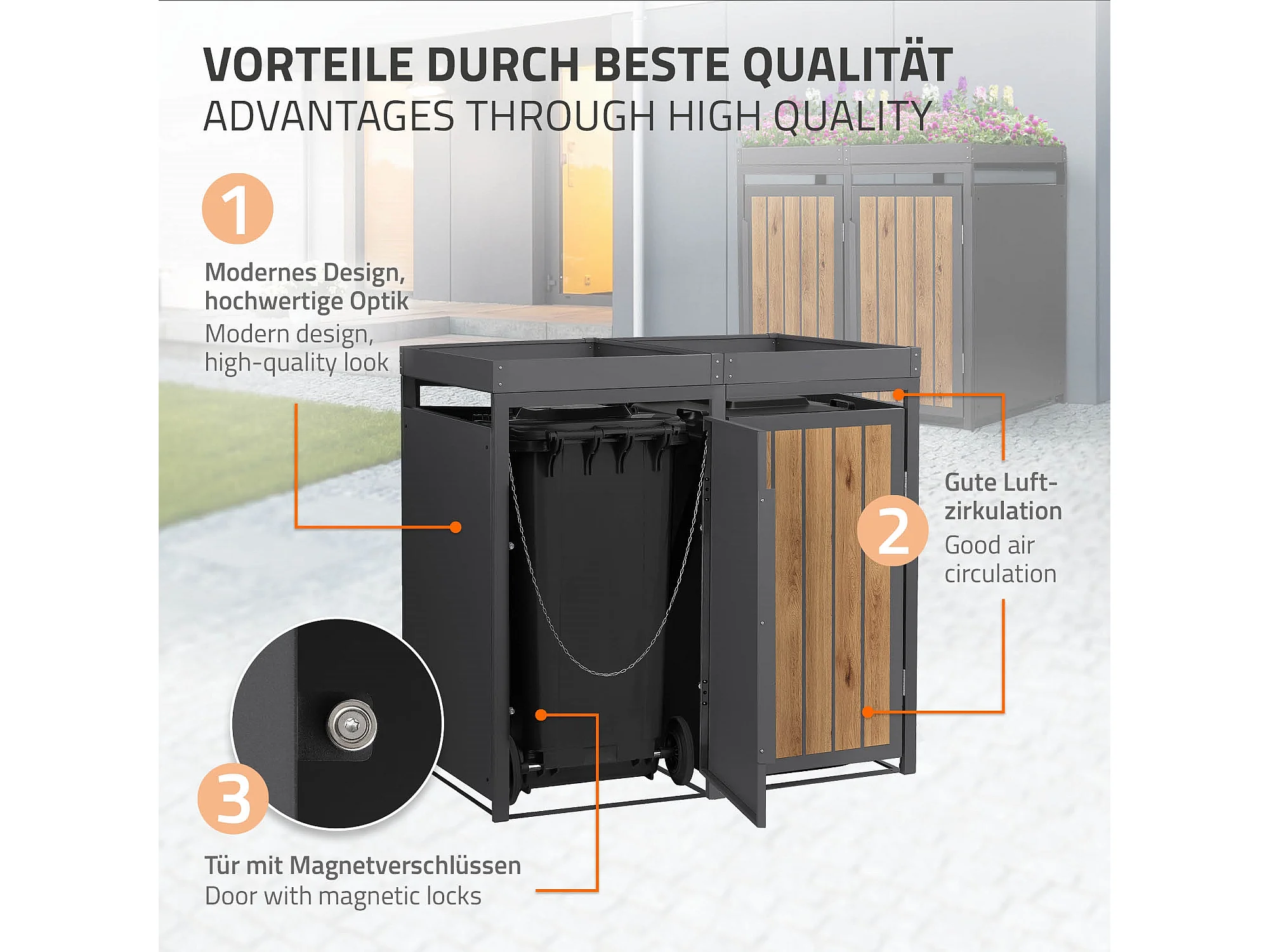 ML-Design Copribidone spazzatura 2 bidoni 240L in acciaio antracite effetto legno con porta e tetto a fioriera, pattumiera da esterno, deposito bidoni