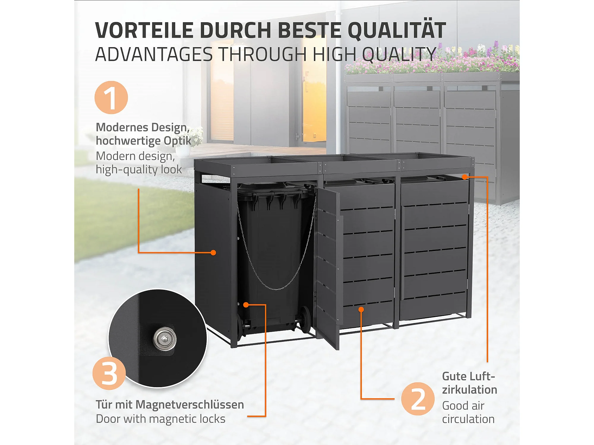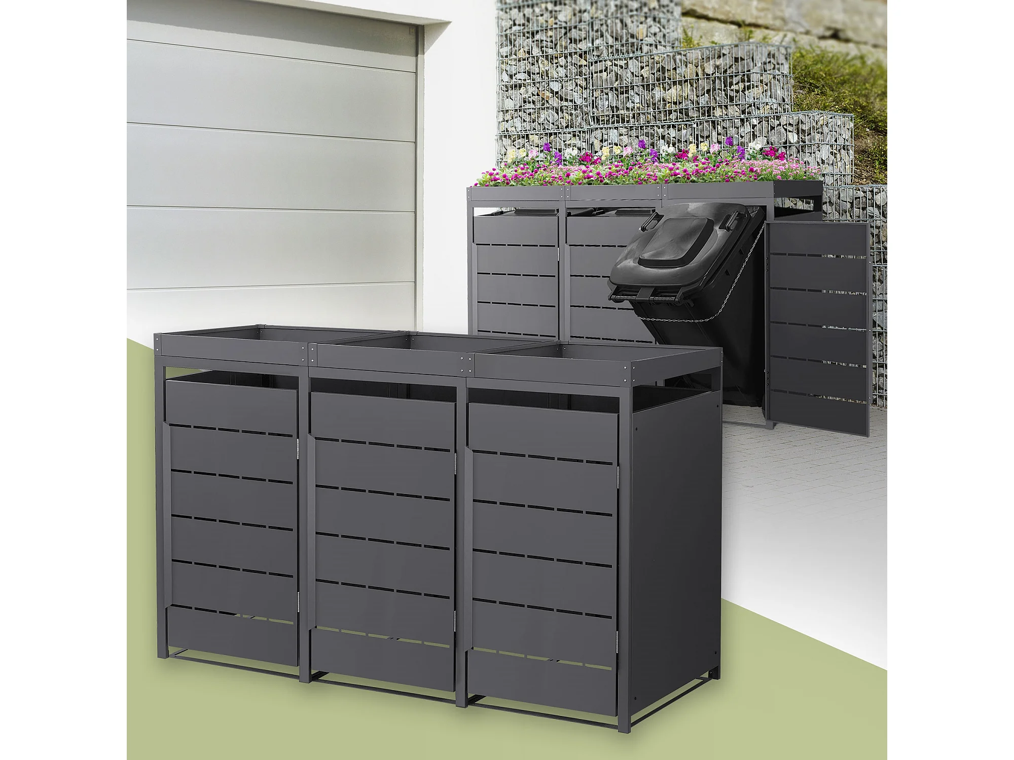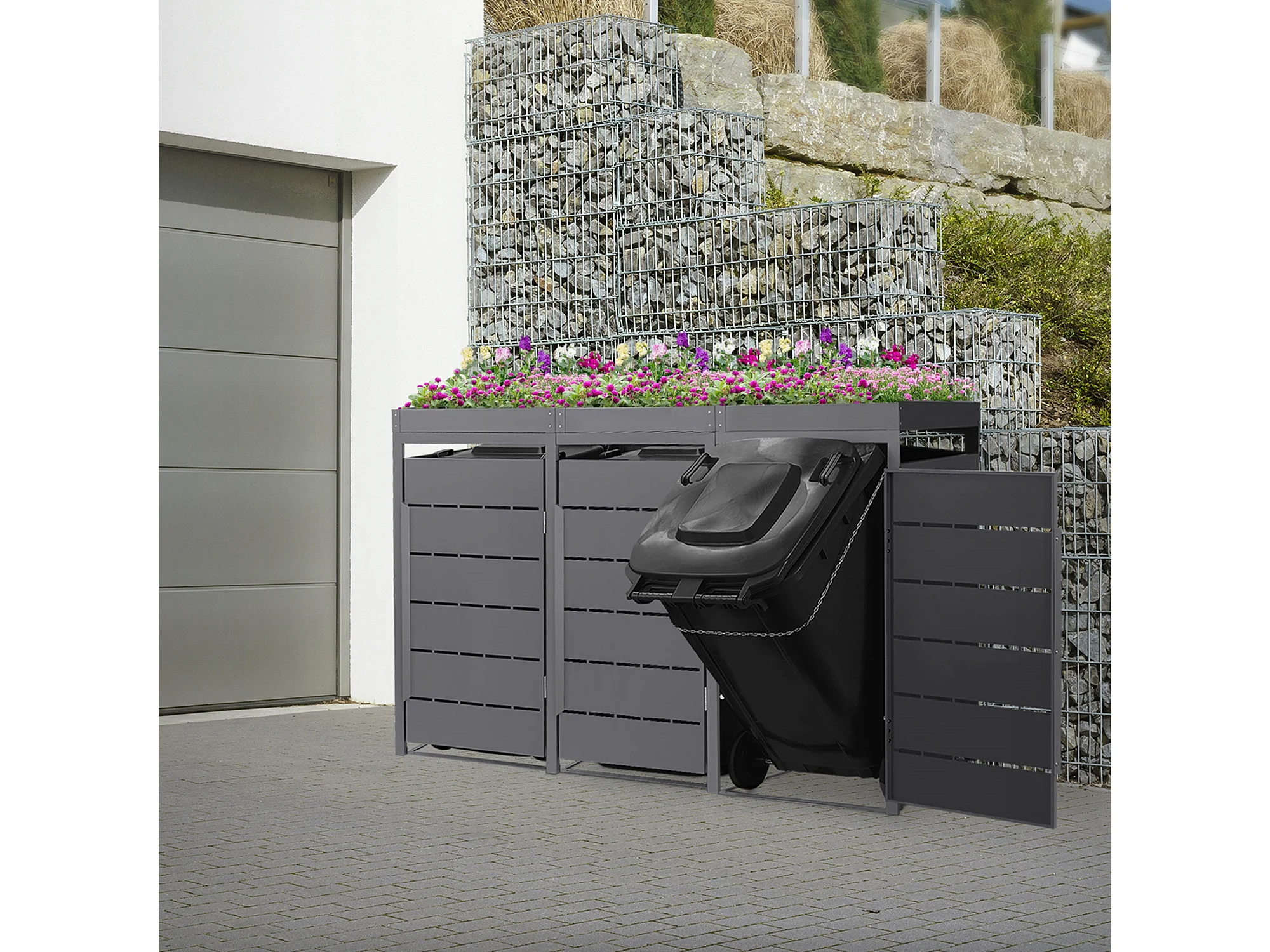 ML-Design Copribidone spazzatura per 3 bidoni 240L acciaio antracite con porta e tetto a fioriera, pattumiera da esterno resistente alle intemperie