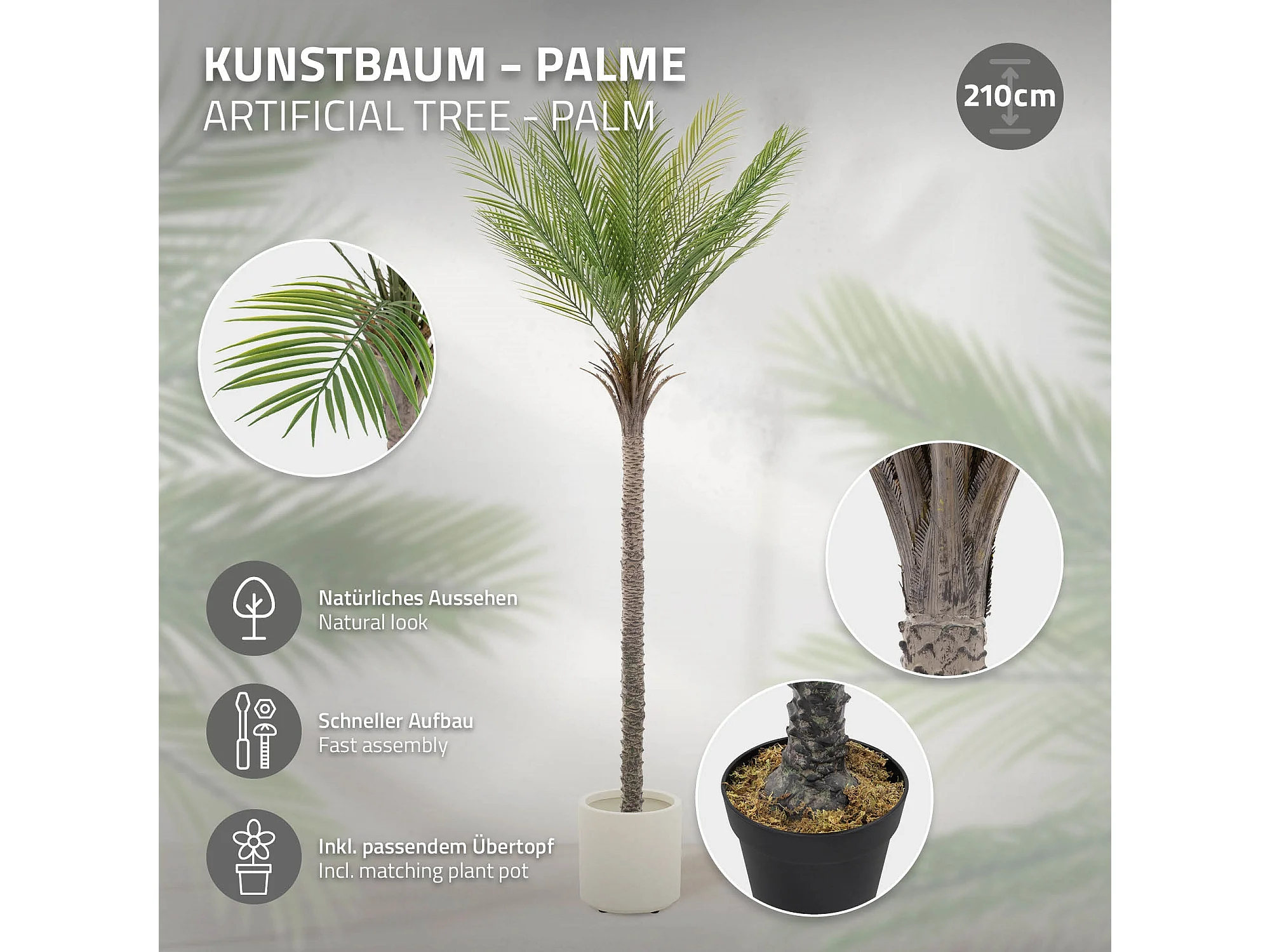 ML-Design Palma artificiale 210 cm, grande pianta artificiale, palma tropicale artificiale, pianta artificiale, pianta finta Deko